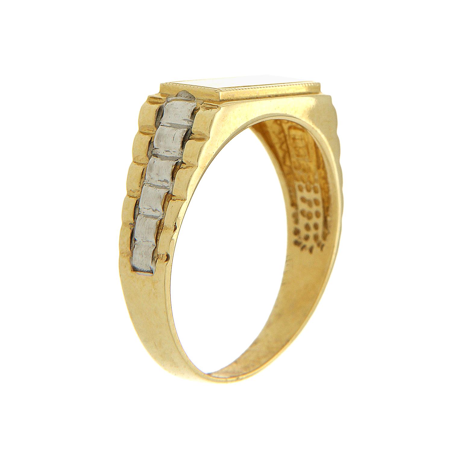 Ιδιαίτερο και εντυπωσιακό ανδρικό δαχτυλίδι σε συνδυασμό από χρυσό και λευκόχρυσο 14 καρατίων (κ585). Στο κέντρο μπορεί να χαραχθεί μονόγραμμα ή ότι άλλο θα επιθυμούσατε, χωρίς επιπλέον χρέωση.