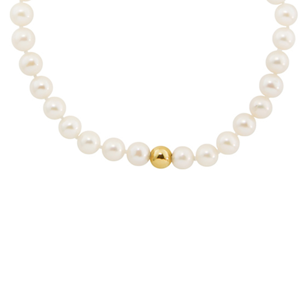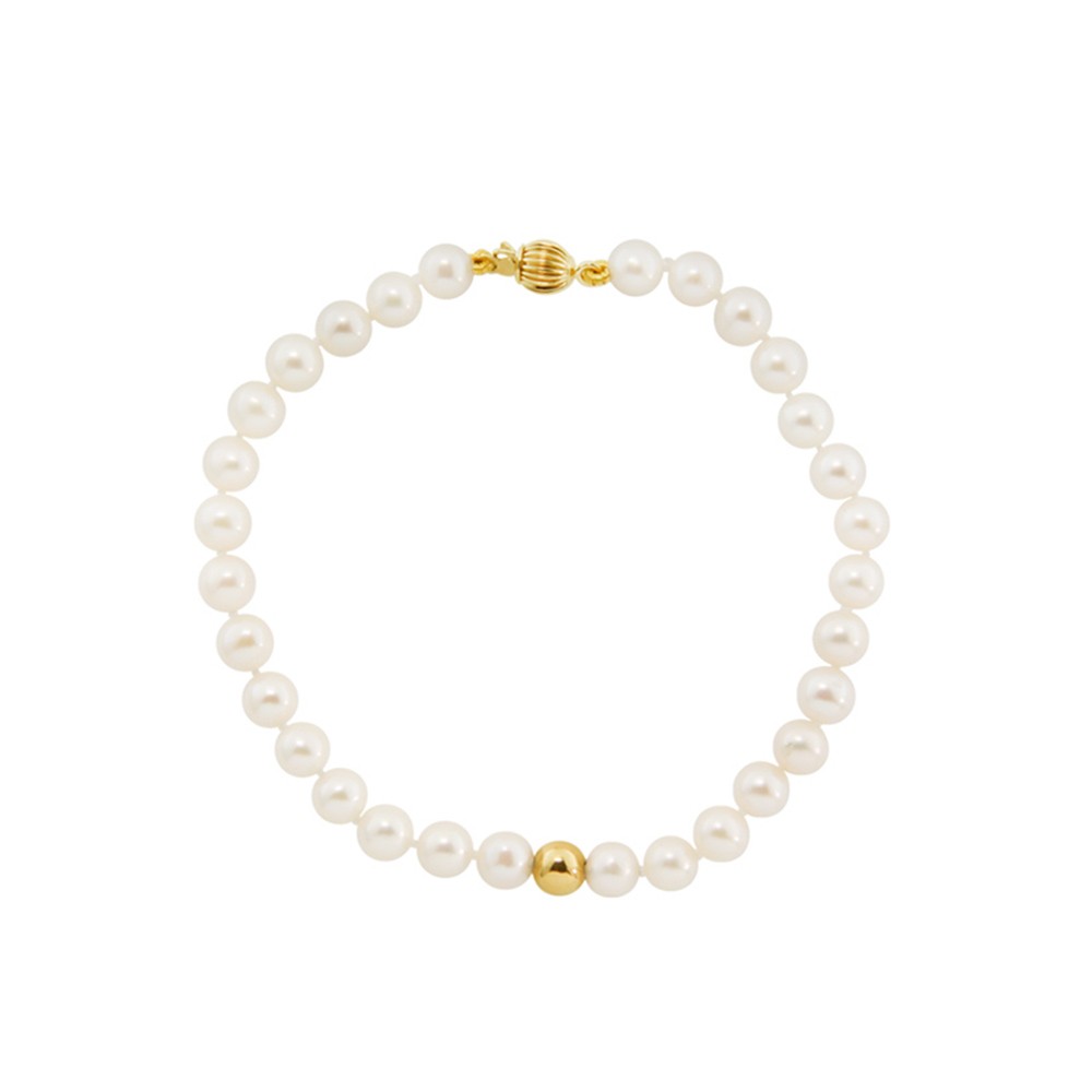 Διαχρονικό βραχιόλι με κούμπωμα από κίτρινο χρυσό 14 καρατίων (585) με εντυπωσιακά fresh water μαργαριτάρια διαμέτρου 5-5.50 χιλιοστών και στο κέντρο χρυσή μπίλια ίδιας διαμέτρου.