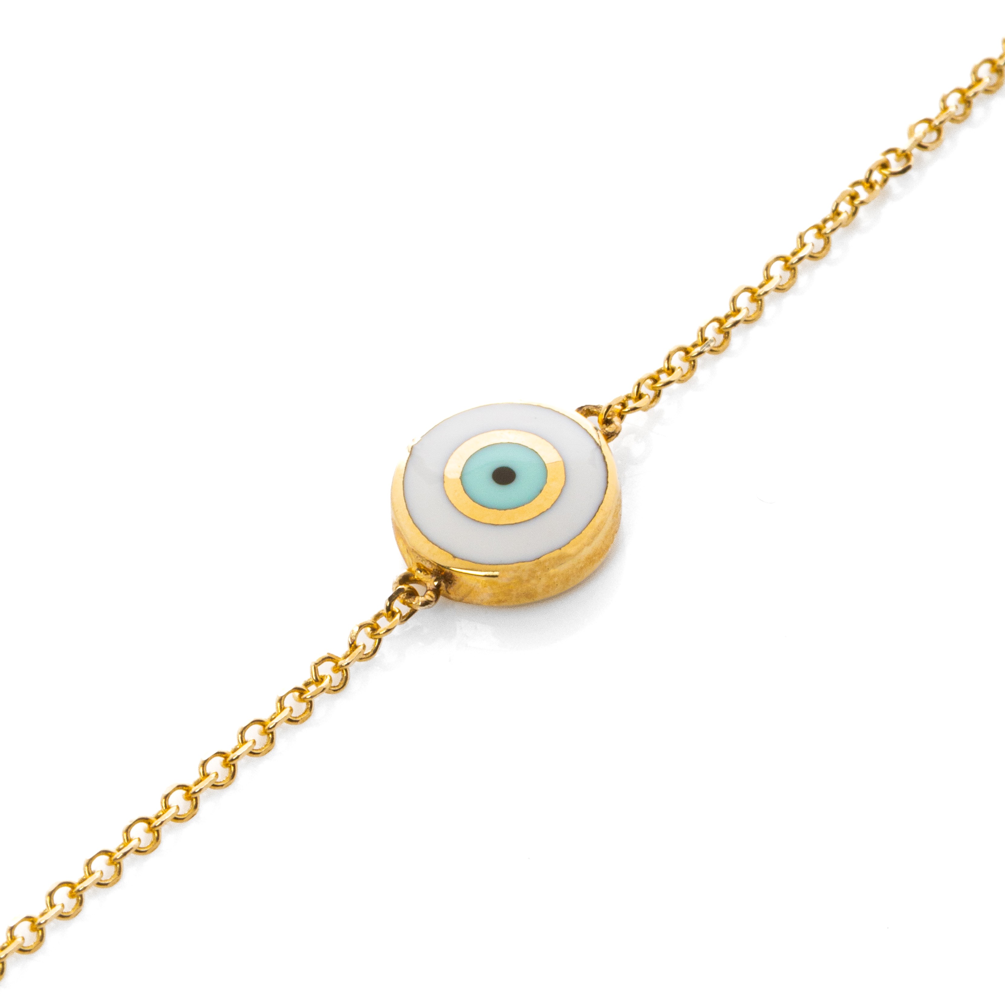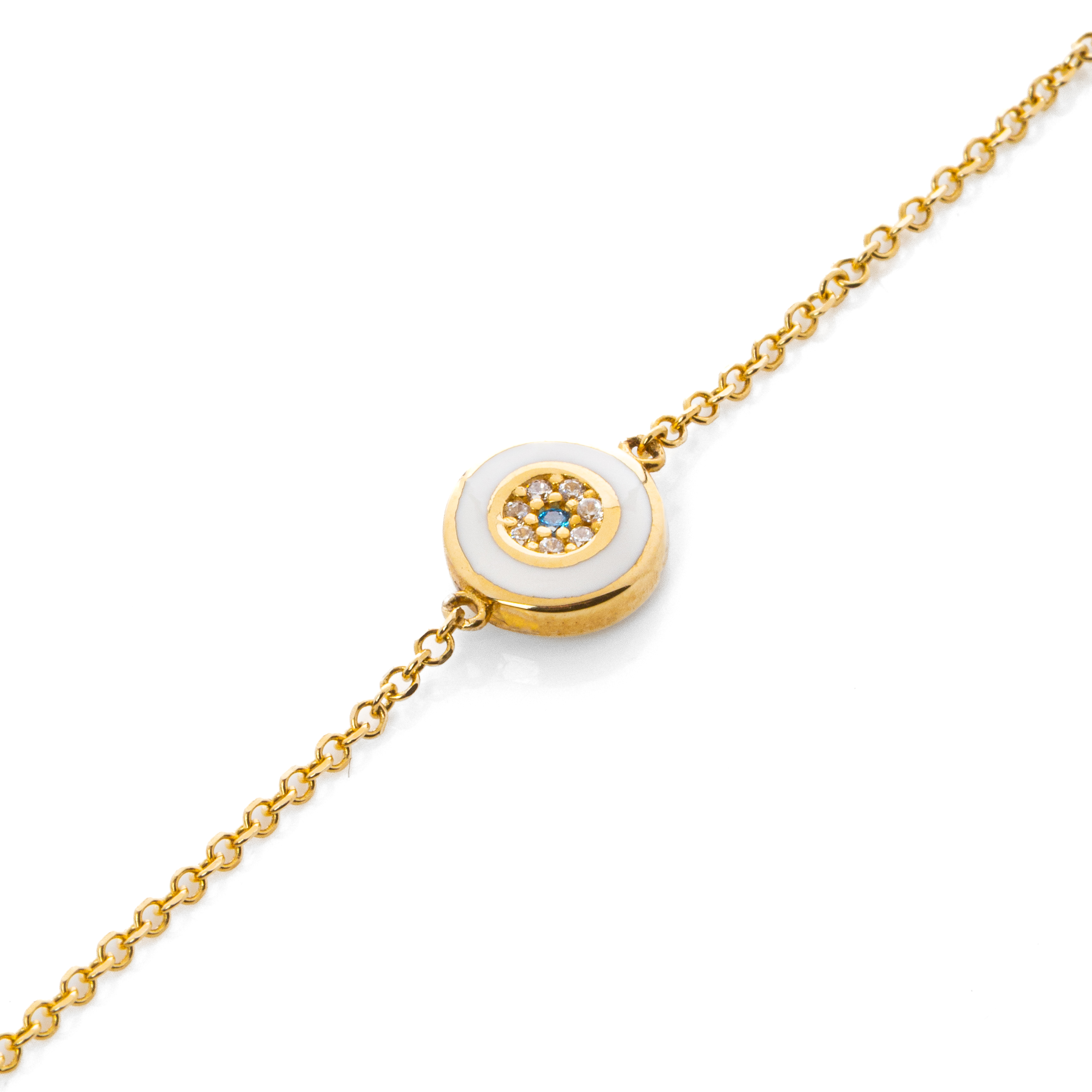 Βραχιόλι μάτι από κίτρινο χρυσό 14 καρατίων(585) διπλής όψης με λευκό σμάλτο από τη μία πλευρά και επιπλέον πέτρες από την άλλη. Το βραχιόλι κουμπώνει σε δύο μήκη.