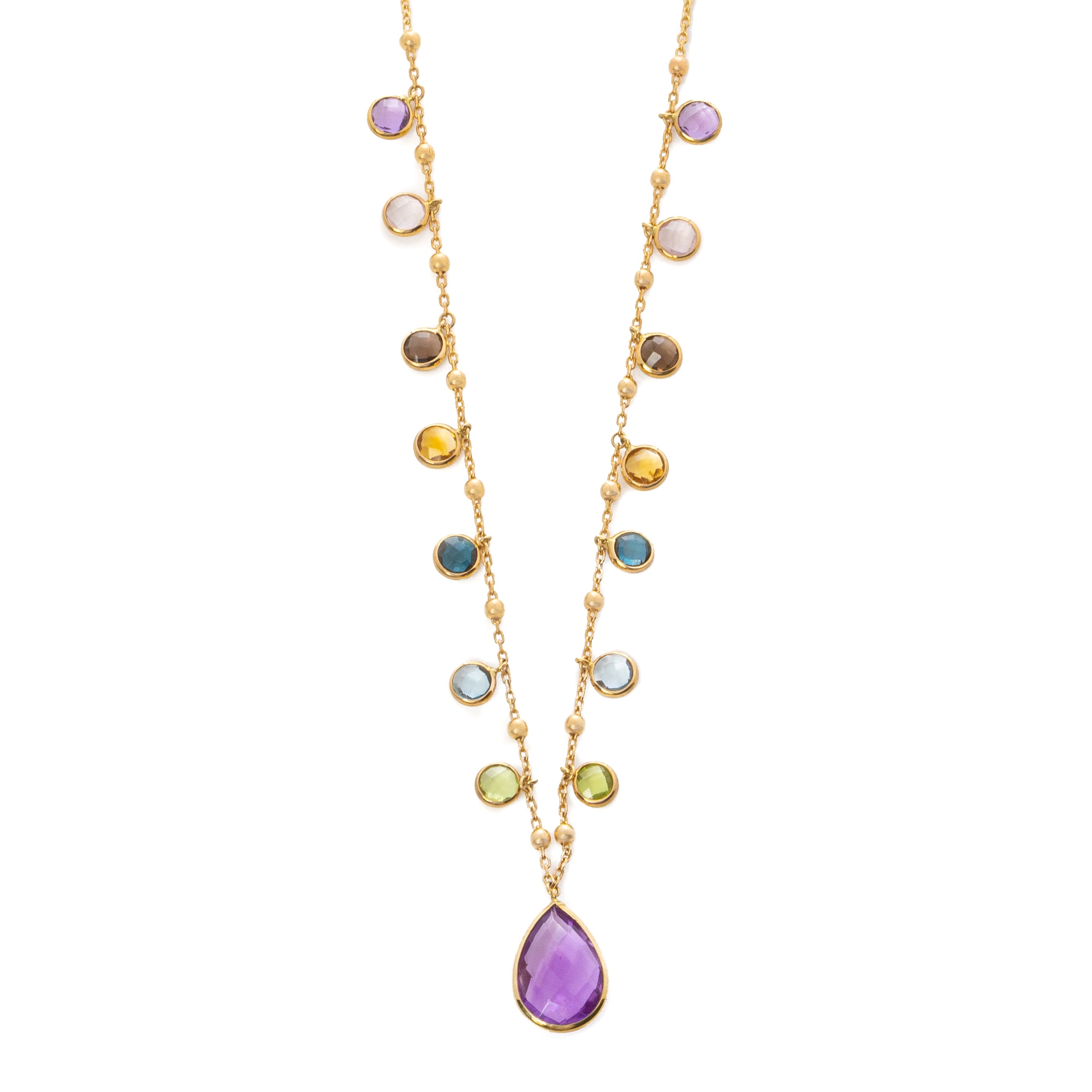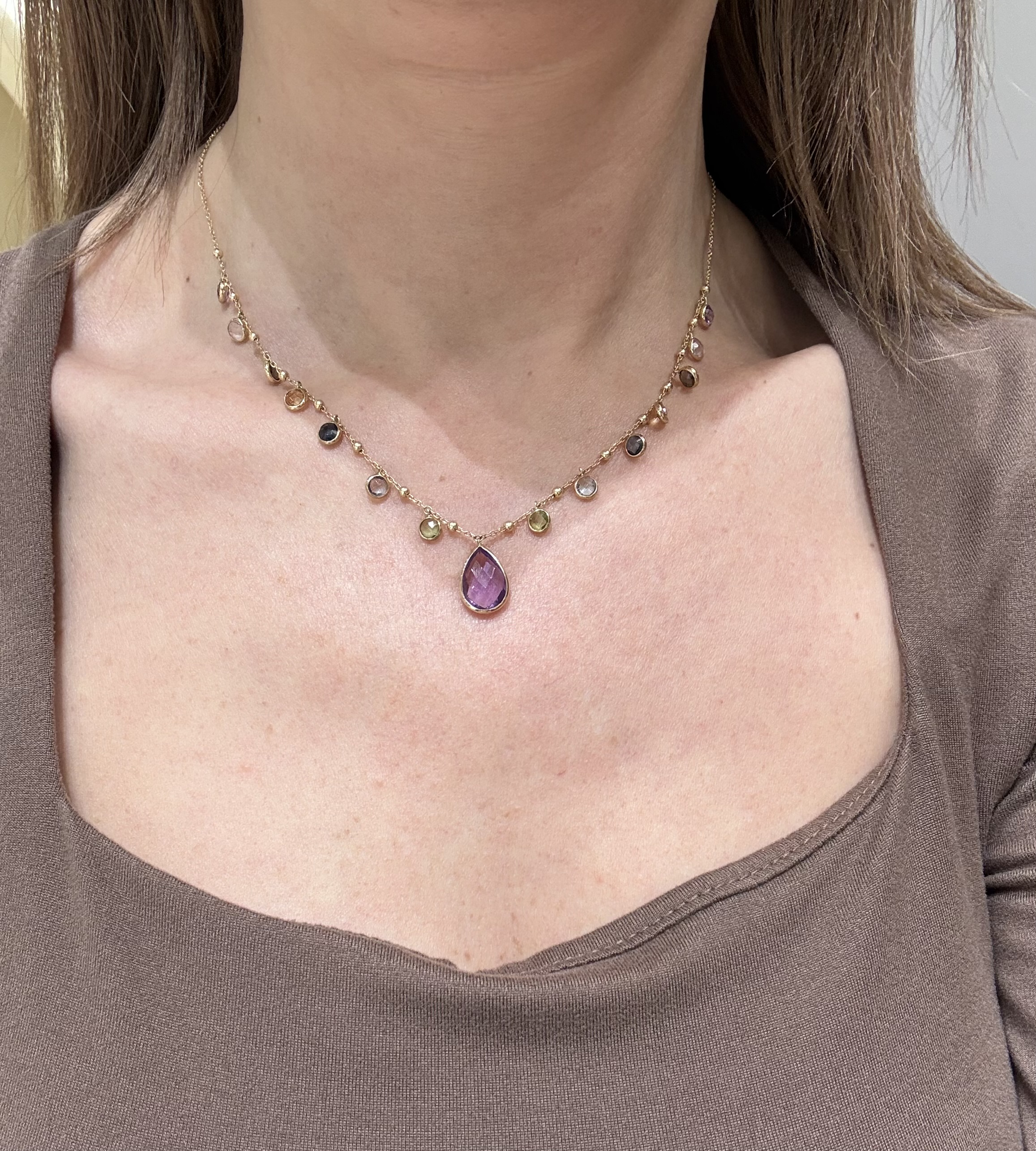 Εντυπωσιακό κολιέ από κίτρινο χρυσό 14 καρατίων (585) με διάφορες ορυκτές πέτρες (τοπάζ, αμέθυστους, σιτρίν, περίδοτους και αχάτες). Στο κέντρο τους κρέμεται ένας μεγαλύτερος αμέθυστος σε σχήμα δάκρυ.