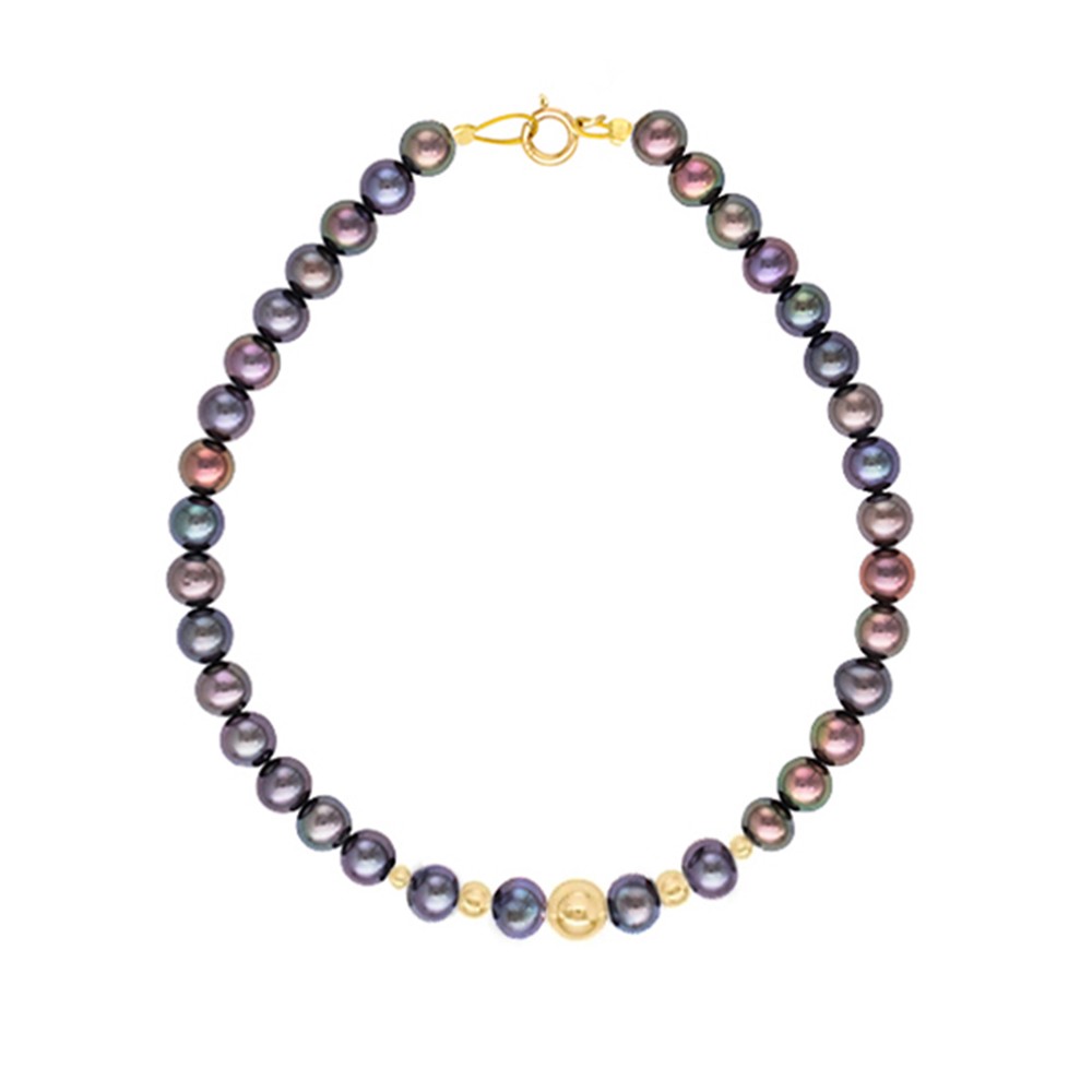 Διαχρονικό βραχιόλι με μαύρα Fresh Water Pearl 4,5-5 χιλιοστών, με κούμπωμα από κίτρινο χρυσό 14 καρατίων(585). Στο κέντρο του υπάρχουν 5 χρυσές μπίλιες και αυτές 14 καρατίων(585), στο κέντρο μία μεγαλύτερη και μικρότερες στο πλάι.