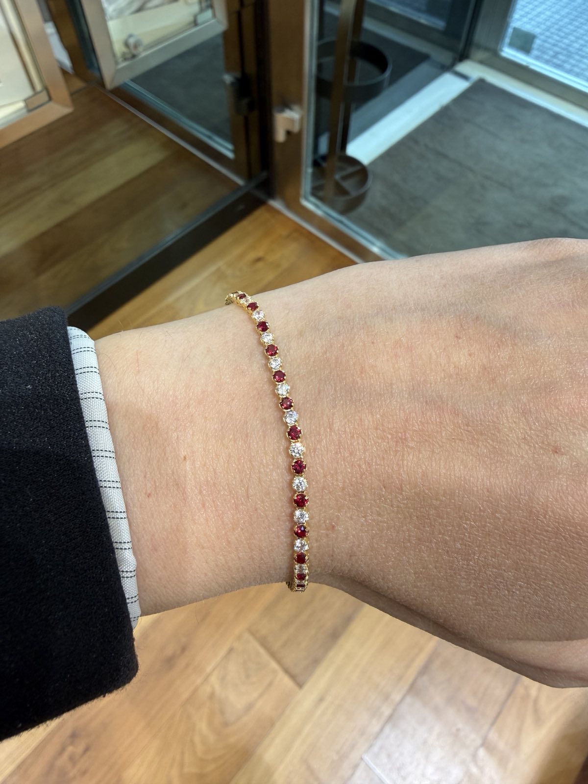 Βραχιόλι ριβιέρα από κίτρινο χρυσό 14 καρατίων (585) με συνθετικές πέτρες κόκκινες και λευκές.