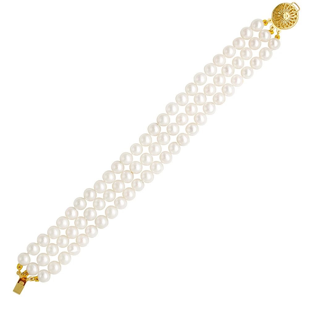 Βραχιόλι με τρεις σειρές λευκά μαργαριτάρια 6-6.5 χιλιοστών από κίτρινο χρυσό 14 καρατίων (585) και χρυσό κούμπωμα.