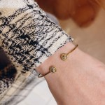 Εντυπωσιακό, διαχρονικό, γυαλιστερό βραχιόλι σε σταθερό σχέδιο (χειροπέδα) από χρυσό 14 καρατίων (585). Η χειροπέδα αυτή περιέχει ένα κενό στο κέντρο και στις δύο άκρες της περιέχει λευκόχρυσες μπίλιες που περιβάλλονται από διπλές κίτρινες χρυσές πλεξούδες.