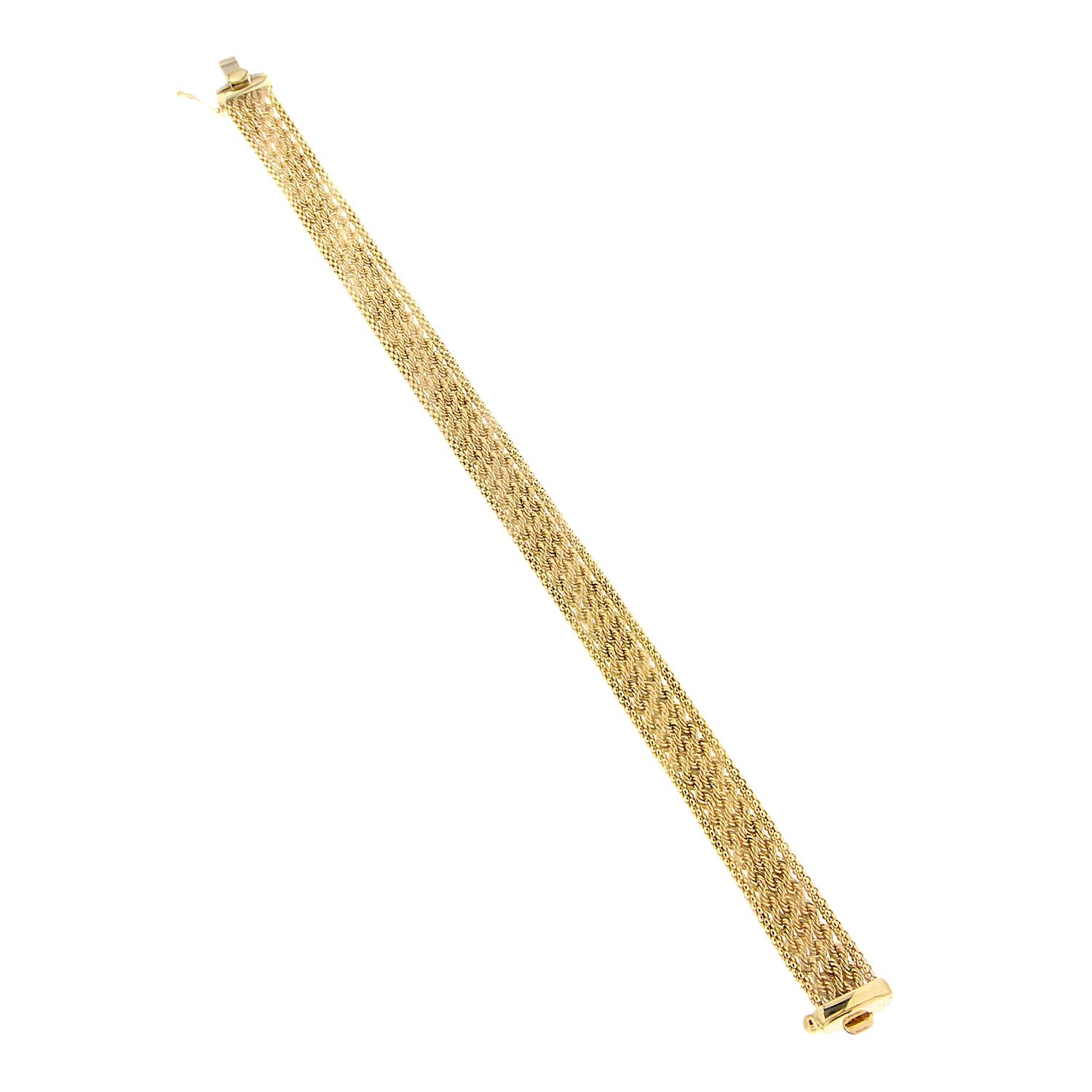 Εντυπωσιακό, διαχρονικό, ματ βραχιόλι σε σταθερό σχέδιο (χειροπέδα) από σκέτο κίτρινο χρυσό 14 καρατίων. Η επιφάνειά του έχει πλεκτό σχέδιο και περιέχει διάφορα κενά σημεία μέσα από τα οποία φαίνεται ελαφρώς το δέρμα και του προσδίδει μία εντυπωσιακή εικόνα.