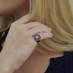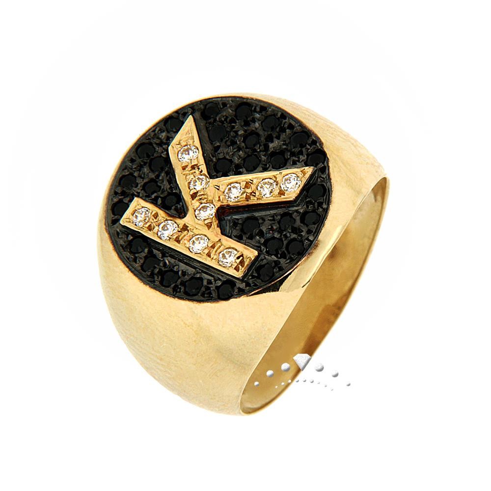 Μοντέρνο, γυαλιστερό, στρογγυλεμένο δαχτυλίδι chevalier από κίτρινο χρυσό 14 καρατίων (585). Αποτελείται σε όλη του την επάνω επιφάνεια από μαύρες συνθετικές ζιργκόν πέτρες, ενώ το γράμμα που σχηματίζεται αποτελείται από αστραφτερές λευκές πέτρες.