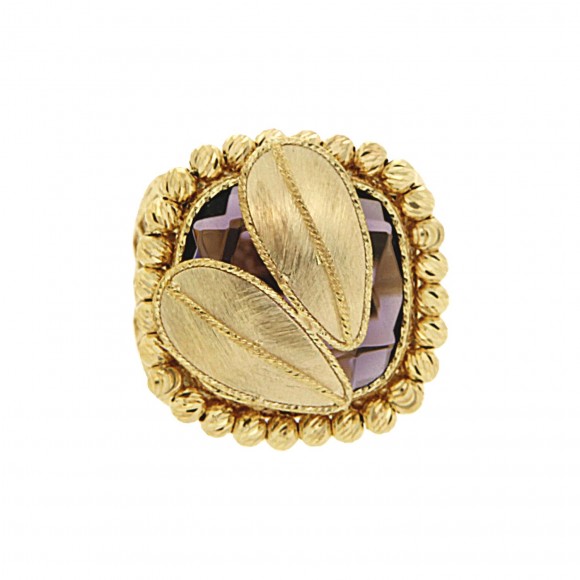 Εντυπωσιακό, χειροποίητο δαχτυλίδι της ιταλίδας σχεδιάστριας κοσμημάτων Gabriela Rigamonti σε κίτρινο χρυσό 14 καρατίων (κ585). Αποτελείται από ορυκτή πέτρα αμέθυστο και επάνω της υπάρχει ένα χρυσό ματ φύλλο σε περίτεχνο σχέδιο.
