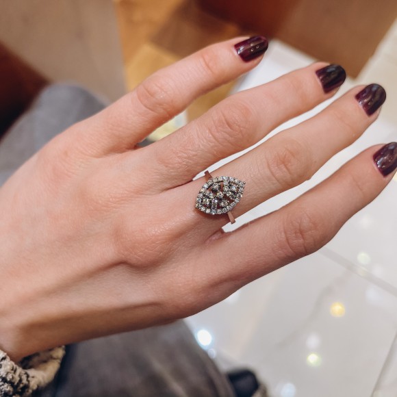 Ένα πολύ όμορφο δαχτυλίδι γυαλιστερό σε σχήμα "νύχι", από λευκόχρυσο 14 καρατίων (κ585). Στο δαχτυλίδι υπάρχουν τριάντα πέντε πέτρες ζιργκόν όλα εξαιρετικής ποιότητας που δίνουν στο κόσμημα αστραφτερή λάμψη.