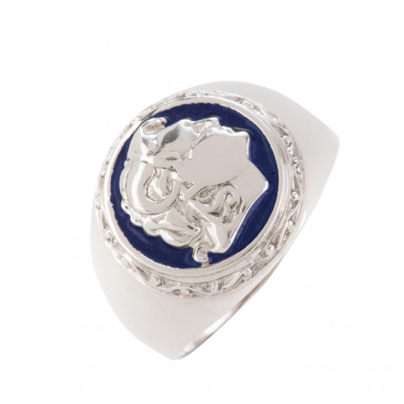 Ανδρικό δαχτυλίδι σκέτο, γυαλιστερό και bombe από λευκόχρυσο 14 καρατίων (585). Το δαχτυλίδι έχει την απεικόνιση του Μεγάλου Αλεξάνδρου και γύρω του περιέχει σμάλτο σε μπλέ χρώμα.