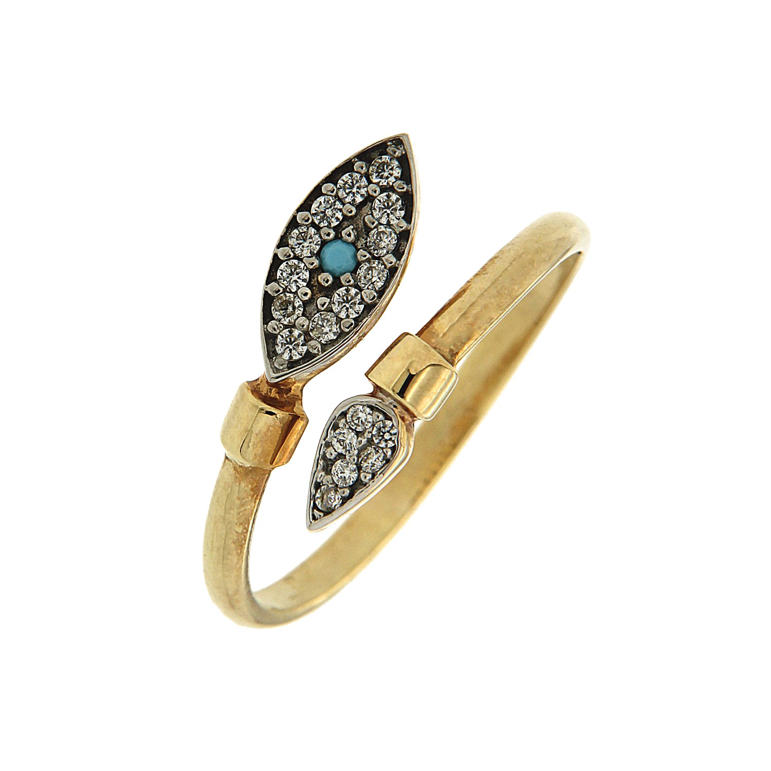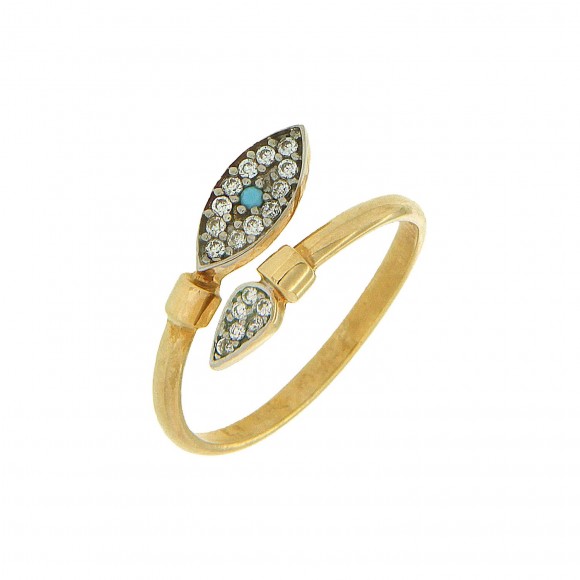 Μοντέρνο και μίνιμαλ λεπτό δαχτυλίδι από κίτρινο χρυσό 14 καρατίων. Το μοτίφ του είναι μάτι και περιέχει 12 λευκές και μία τυρκουάζ συνθετικές ζιργκόν πέτρες και το δάκρυ περιέχει 6 πέτρες λευκές. Το μαυρισμένο τμήμα δημιουργείται με ειδική επεξεργασία και δεν περιέχει κανένα άλλο μέταλλο-υλικό.