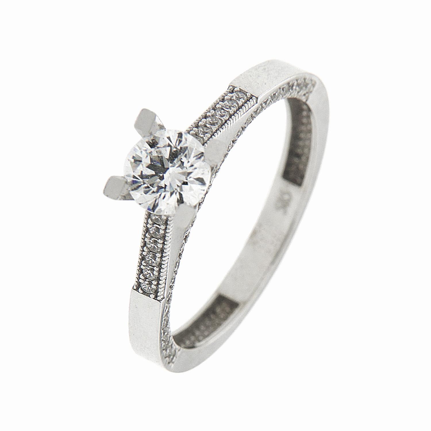 Μονόπετρο κλασσικό με γυαλιστερή βάση από λευκόχρυσο 14 καρατίων. Περιλαμβάνει μία κεντρική συνθετική πέτρα ζιργκόν άριστης ποιότητας και με ιδιαίτερη λάμψη, η οποία στηρίζεται από τέσσερα δοντάκια και γύρω γύρω επάνω στη βάση του δαχτυλιδιού υπάρχουν πολλές μικρότερες ζιργκόν πέτρες.
