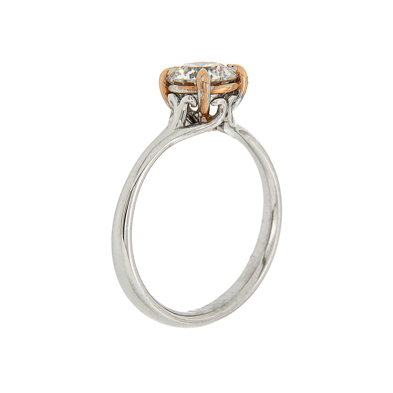 Μονόπετρο με περίτεχνη γυαλιστερή βάση από λευκόχρυσο 14 καρατίων (κ585). Περιλαμβάνει μία κεντρική συνθετική πέτρα ζιργκόν άριστης ποιότητας και με ιδιαίτερη λάμψη, η οποία στηρίζεται από τέσσερα δοντάκια από ροζ χρυσό.