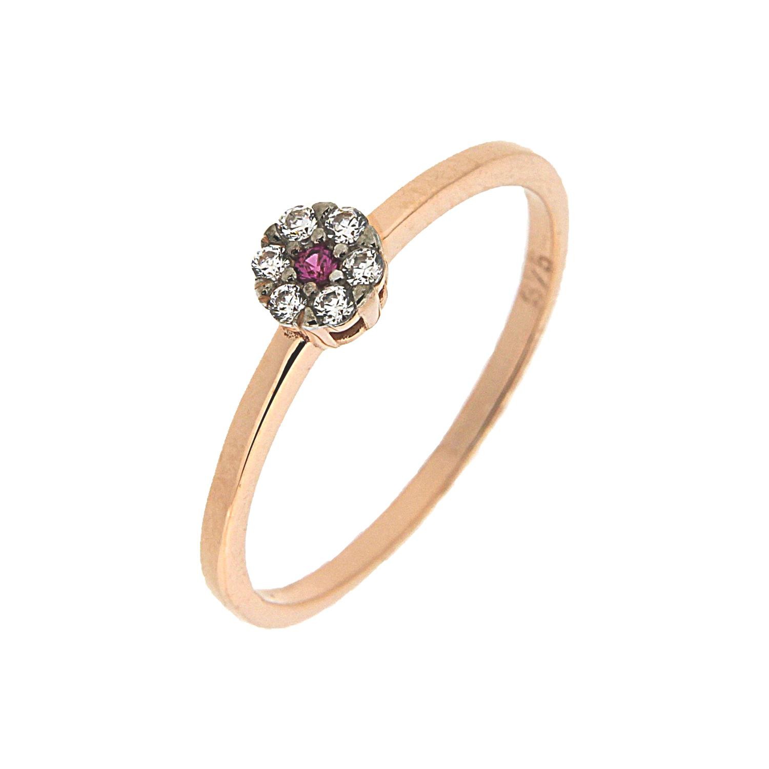 Μίνιμαλ δαχτυλίδι ροζέτα από ροζ χρυσό 9 καρατίων με αστραφτερές, συνθετικές ζιργκόν πέτρες,του ίδιου μεγέθους σε λευκό χρώμα που σχηματίζουν κύκλο που στο κέντρο του υπάρχει μία κόκκινη.
