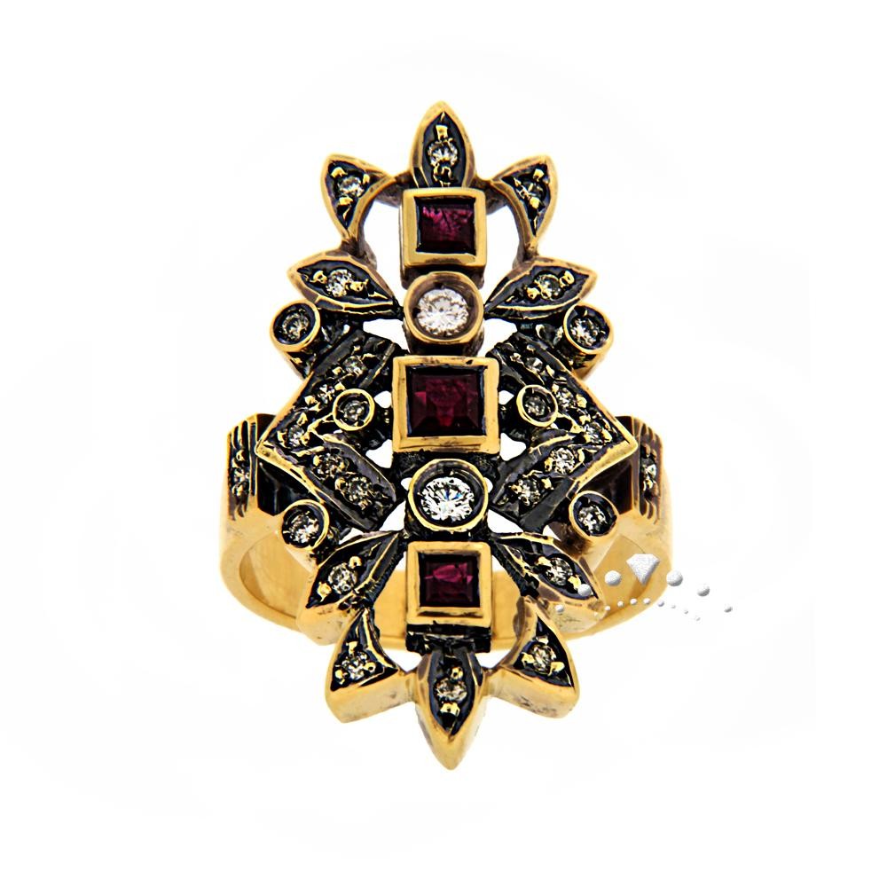 Στο κέντρο τρία ορυκτά ρουμπίνια "καρέ", βάρους 0,65ct (καρατίων) και γύρω τους 30 μπριγιάν (διαμάντια) συνολικού βάρους 0,41ct (καρατίων).