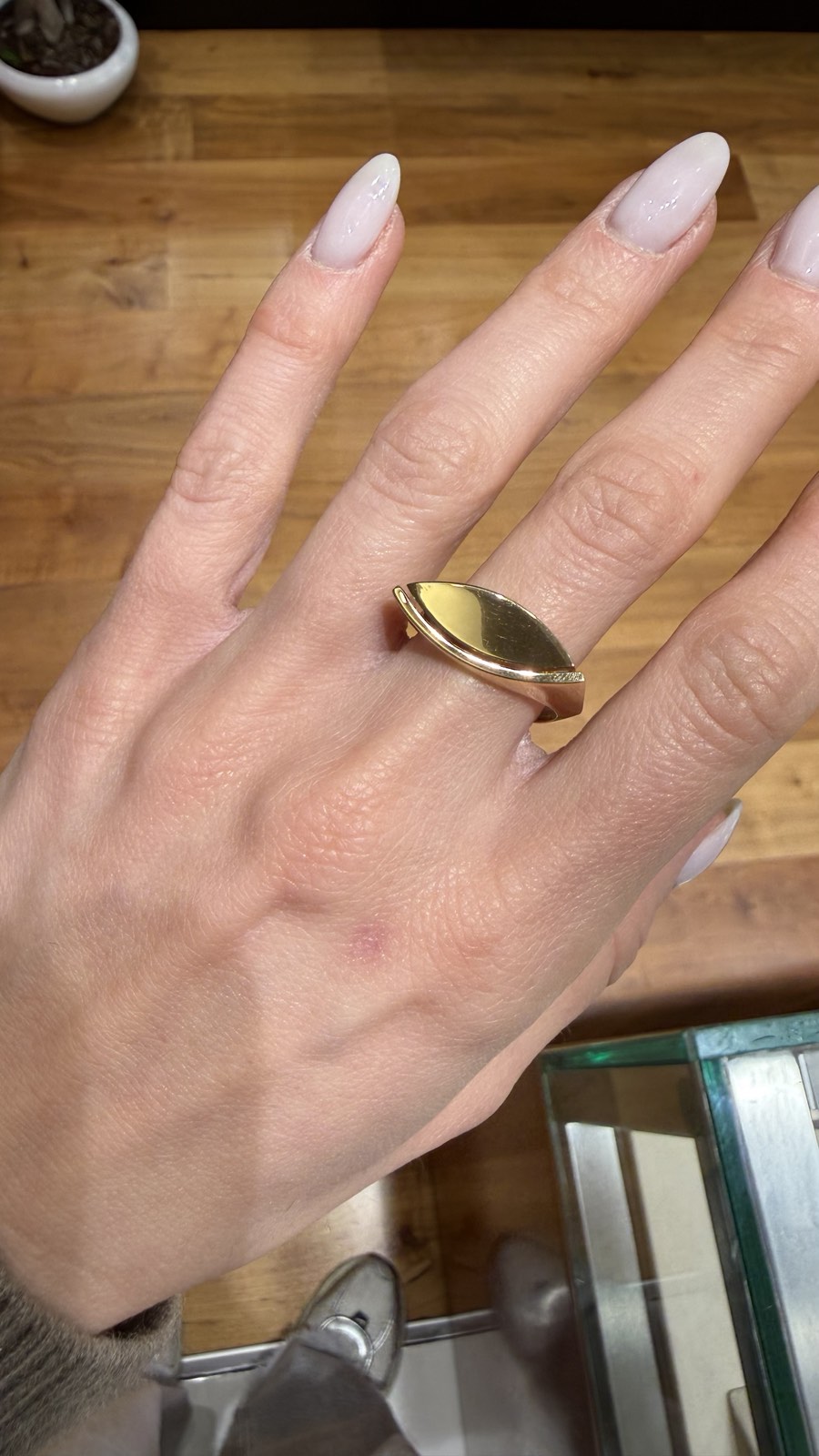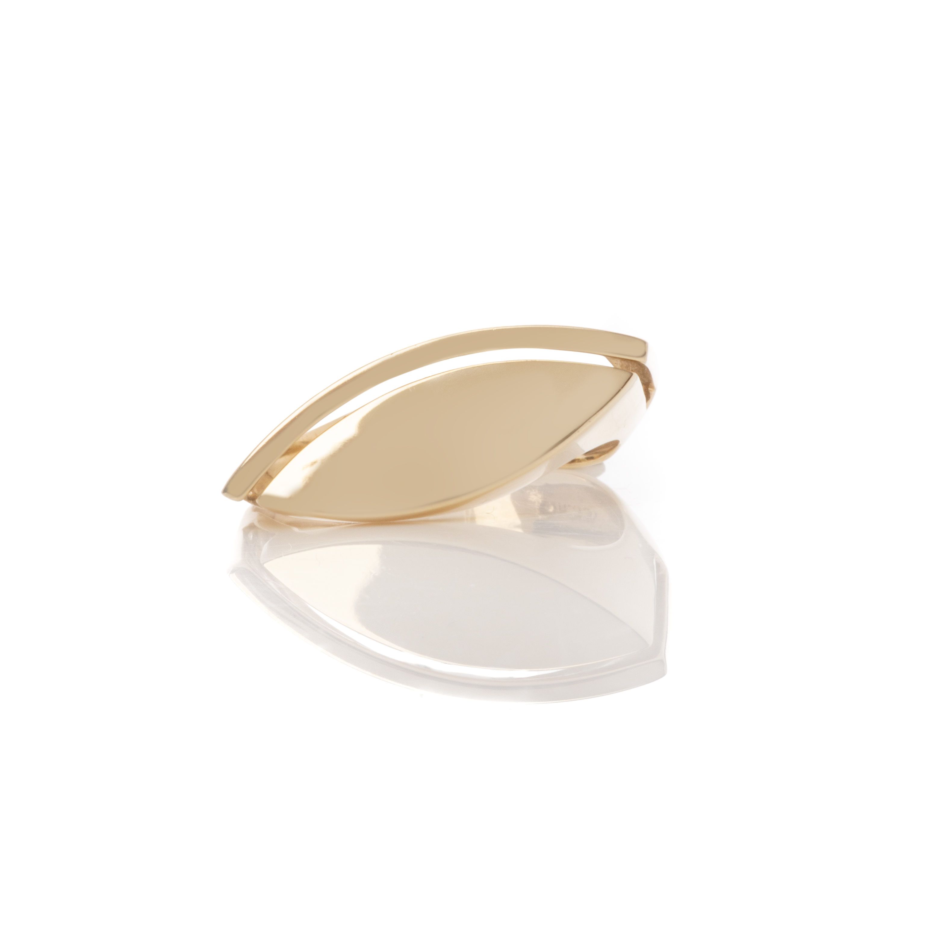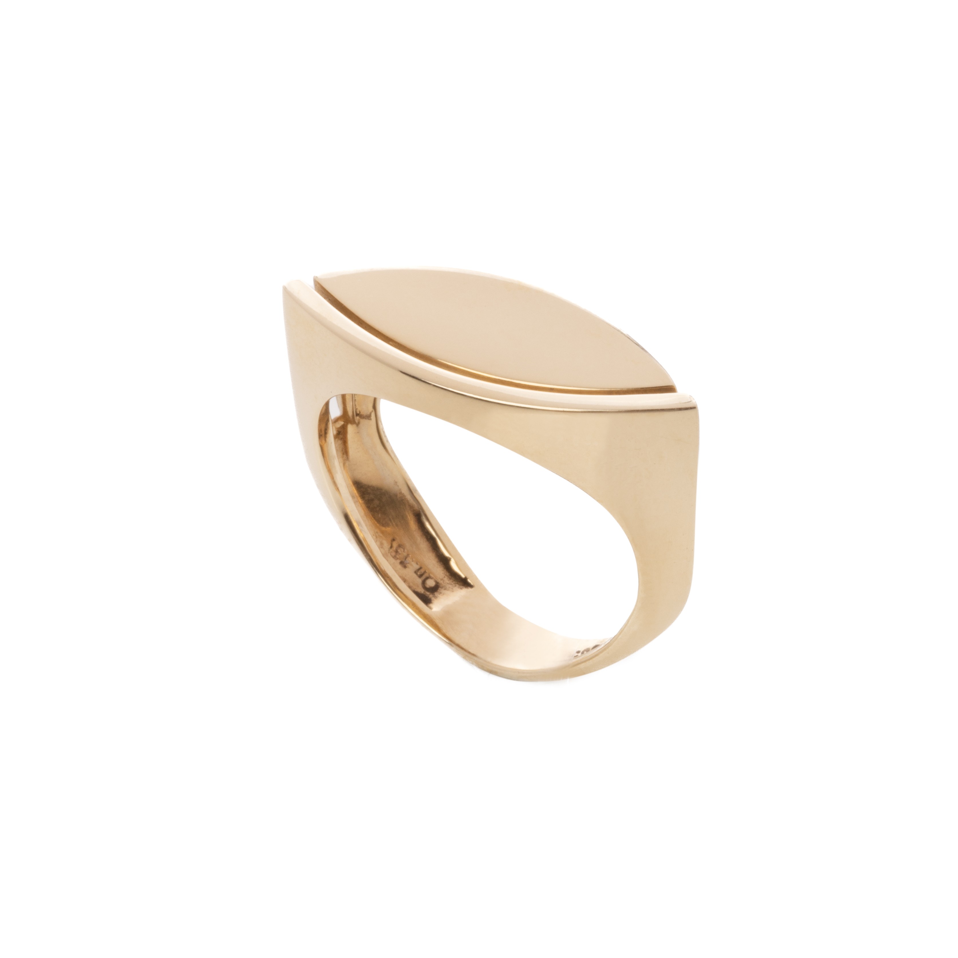 Ιδιαίτεα εντυπωσιακό δαχτυλίδι από κίτρινο χρυσό 14 καρατίων, σκέτο , χωρίς πέτρες. Στο επάνω του τμήμα είναι μακρόστενο και το σχήμα του θυμίζει μάτι.