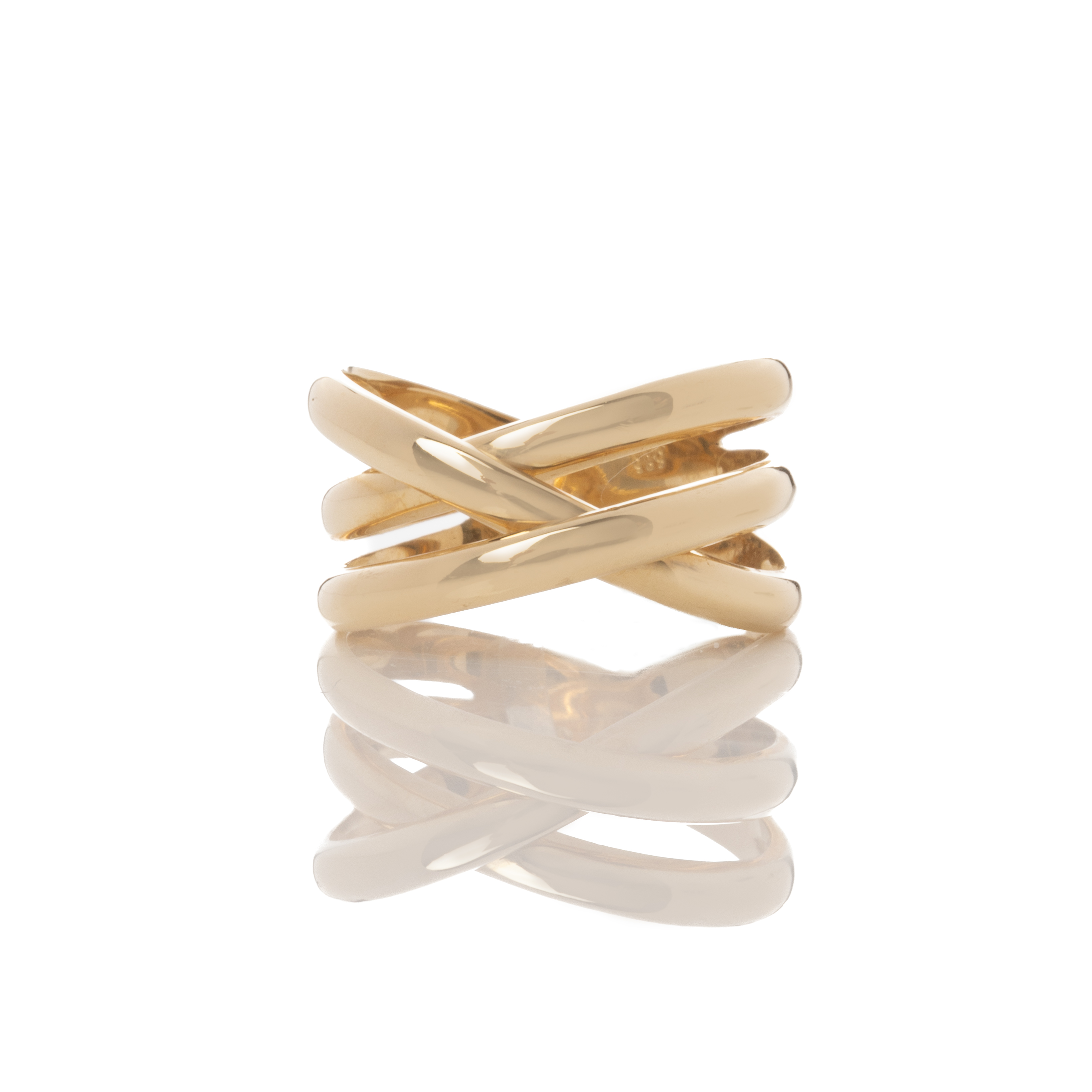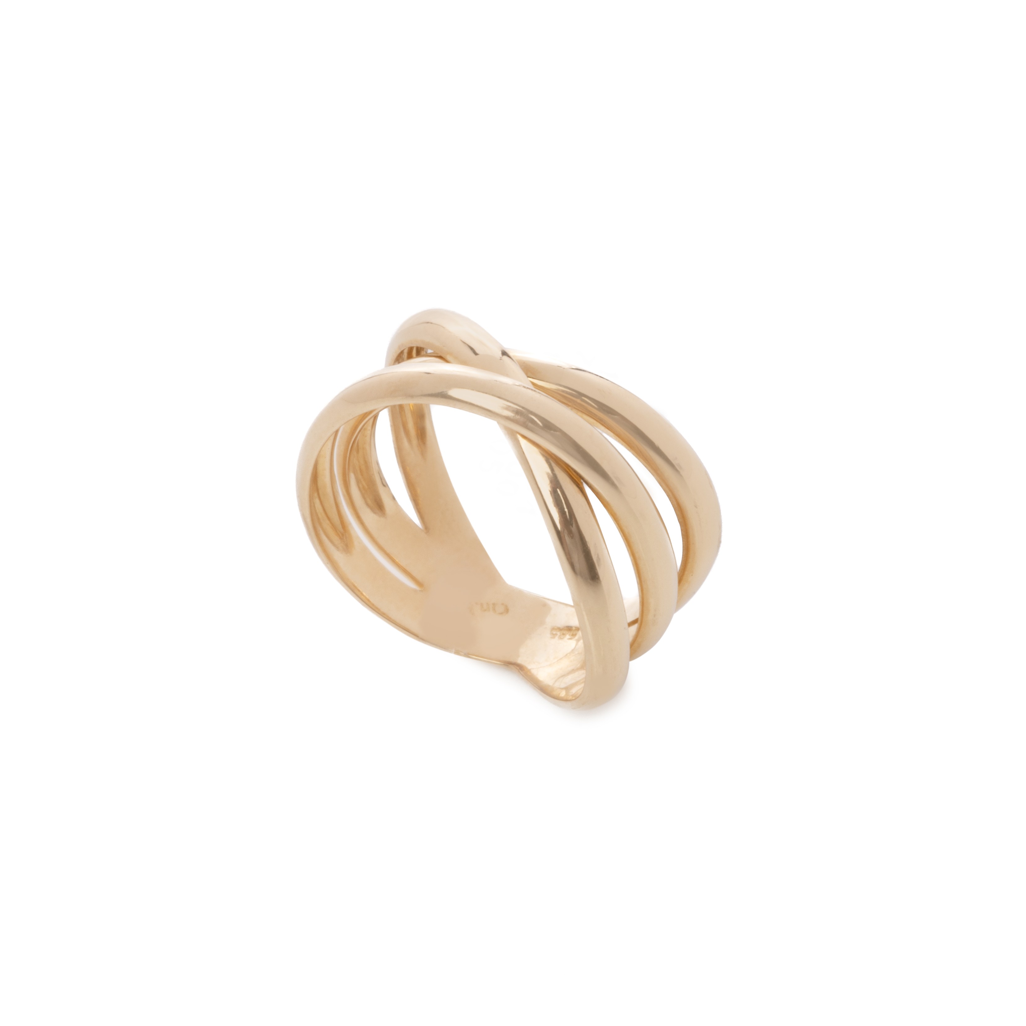Ιδιαίτερα εντυπωσιακό δαχτυλίδι από κίτρινο χρυσό 14 καρατίων, σκέτο , χωρίς πέτρες. Αποτελείται στο επάνω μέρος από τρία βεράκια που είναι μεταξύ τους πλεγμένα.