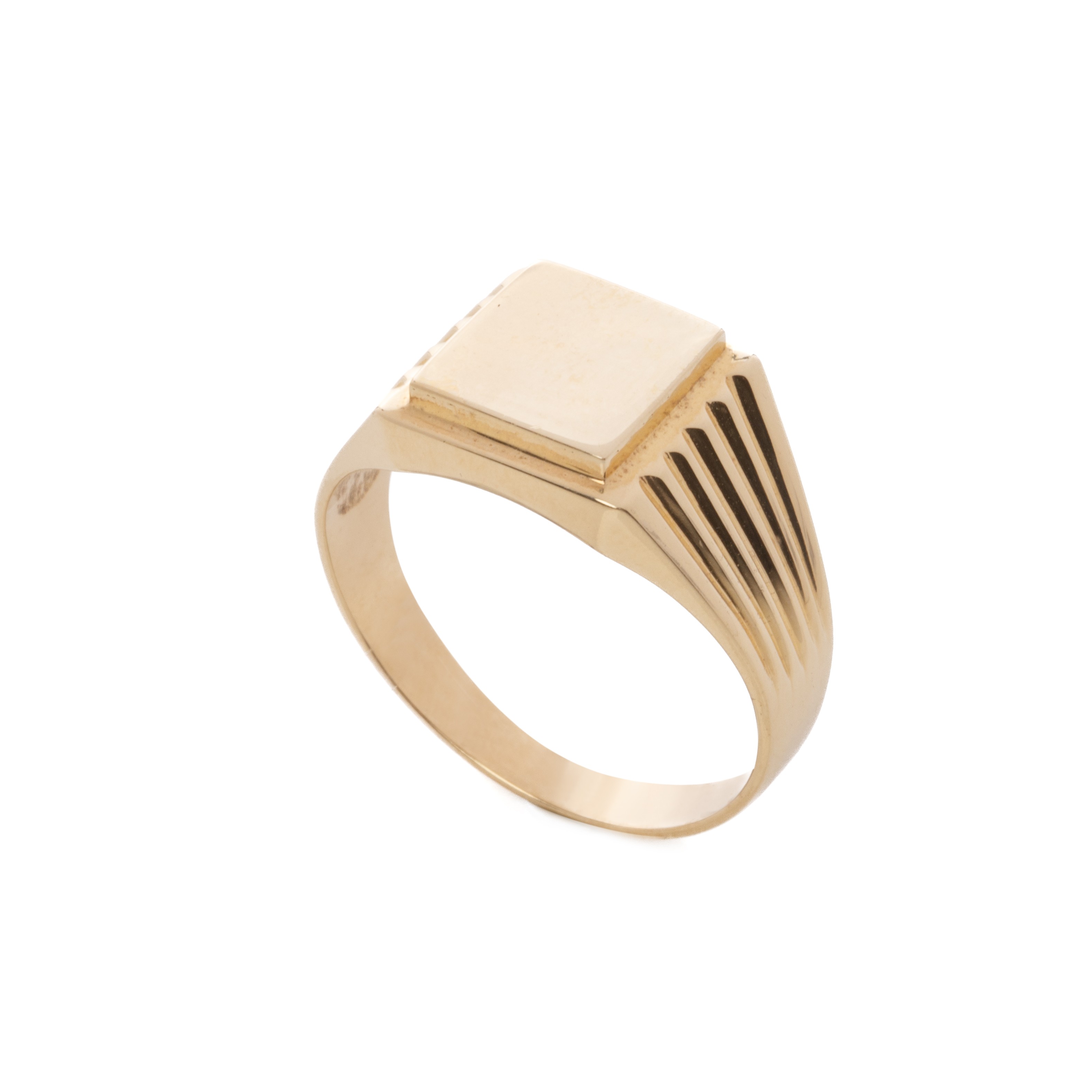 Κλασικό, απλό ανδρικό δαχτυλίδι από κίτρινο χρυσό 14 καρατίων (κ585), σκέτο χωρίς πέτρες με σκάλισμα στο πλαϊνό τμήμα. Στο επάνω τμήμα μπορεί να χαραχθεί μονόγραμμα ή ότι άλλο θα επιθυμούσατε, χωρίς επιπλέον χρέωση.