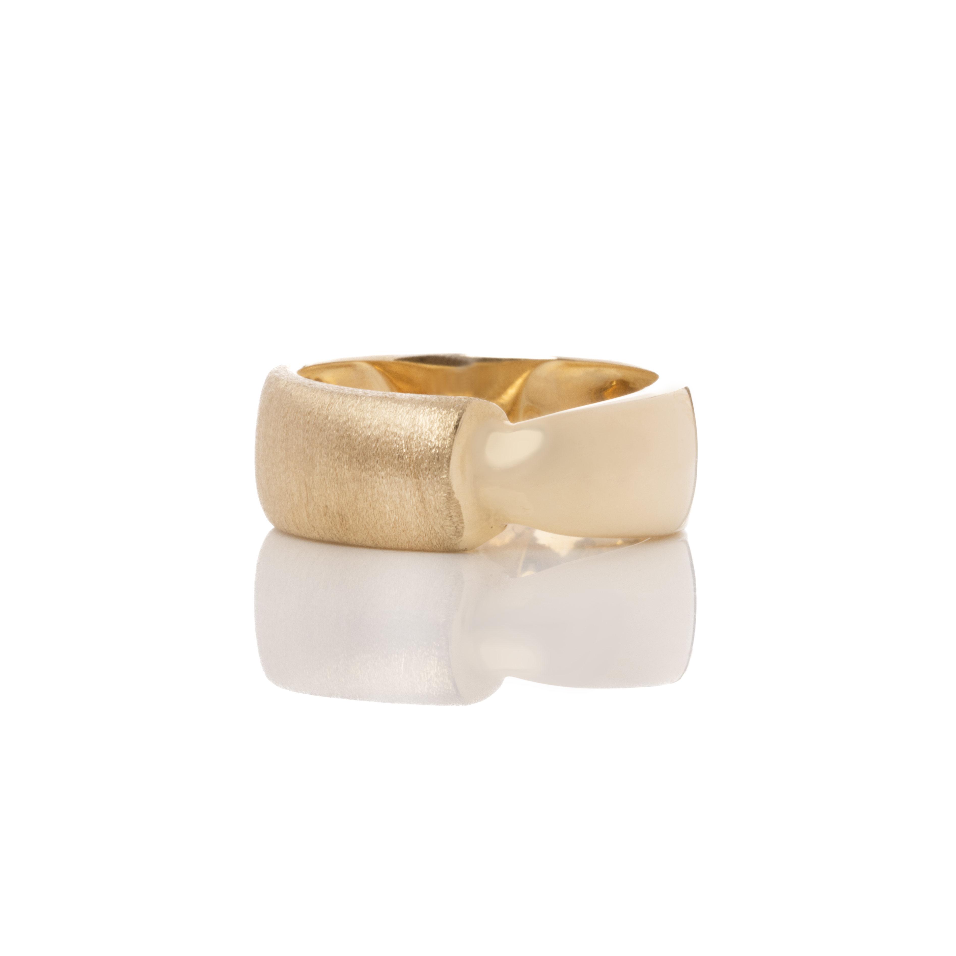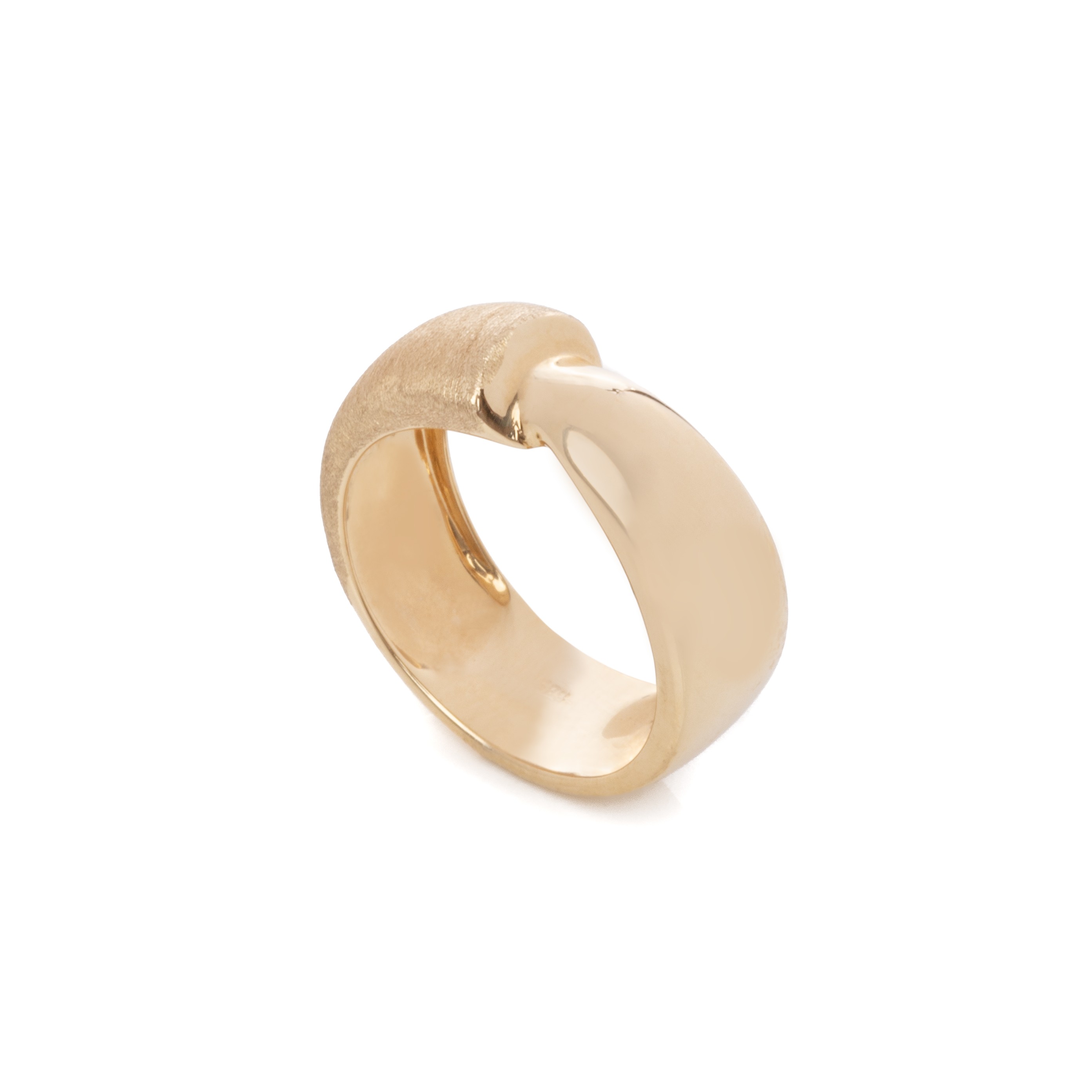 Ιδιαίτεα εντυπωσιακό δαχτυλίδι από κίτρινο χρυσό 14 καρατίων, σκέτο , χωρίς πέτρες. Στο επάνω του τμήμα είναι μισό ματ και μισό γυαλιστερό.