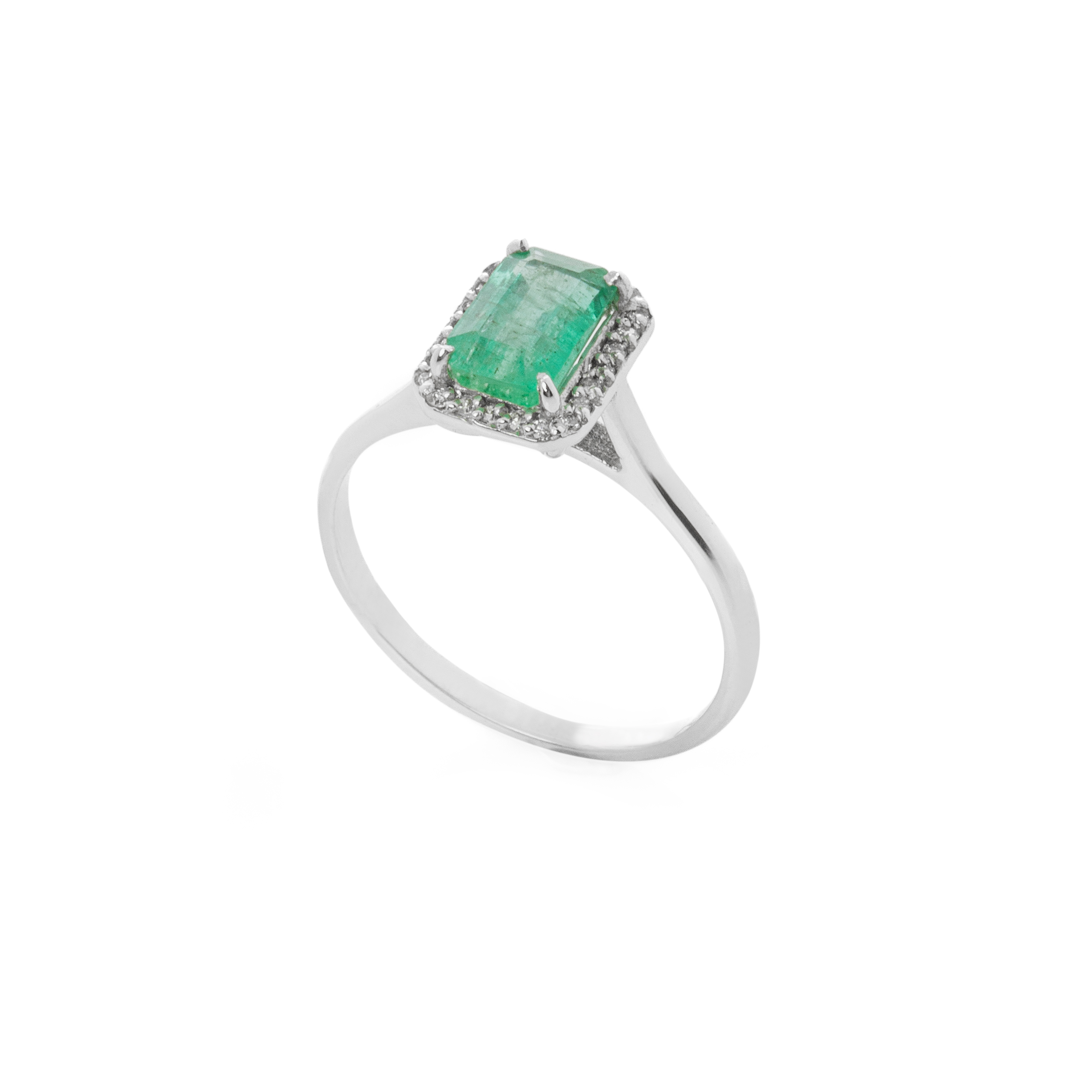 Εντυπωσιακό δαχτυλίδι από λευκόχρυσο 18 καρατίων με αστραφτερά διαμάντια και ορυκτό σμαράγδι emerald κοπής στο κέντρο του.