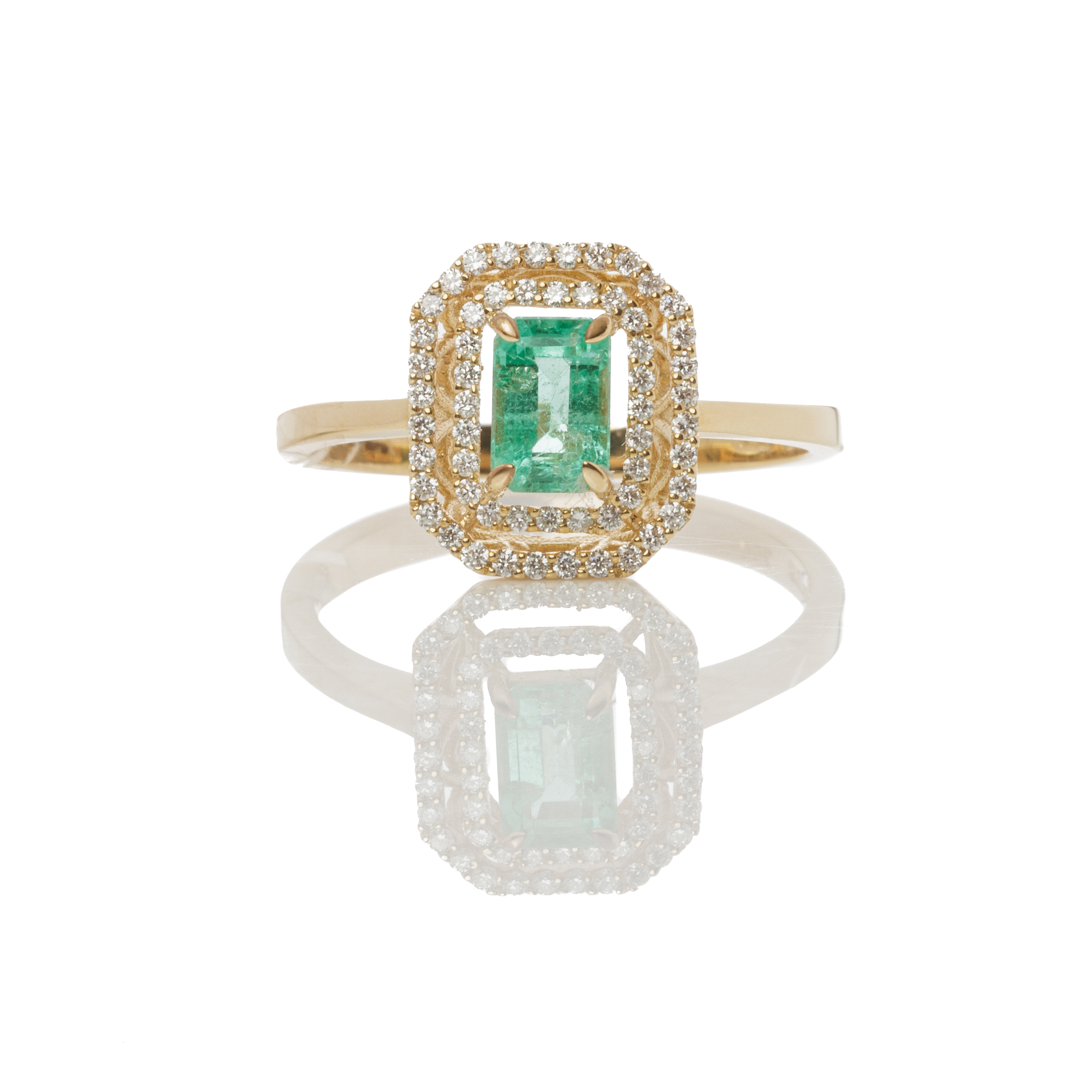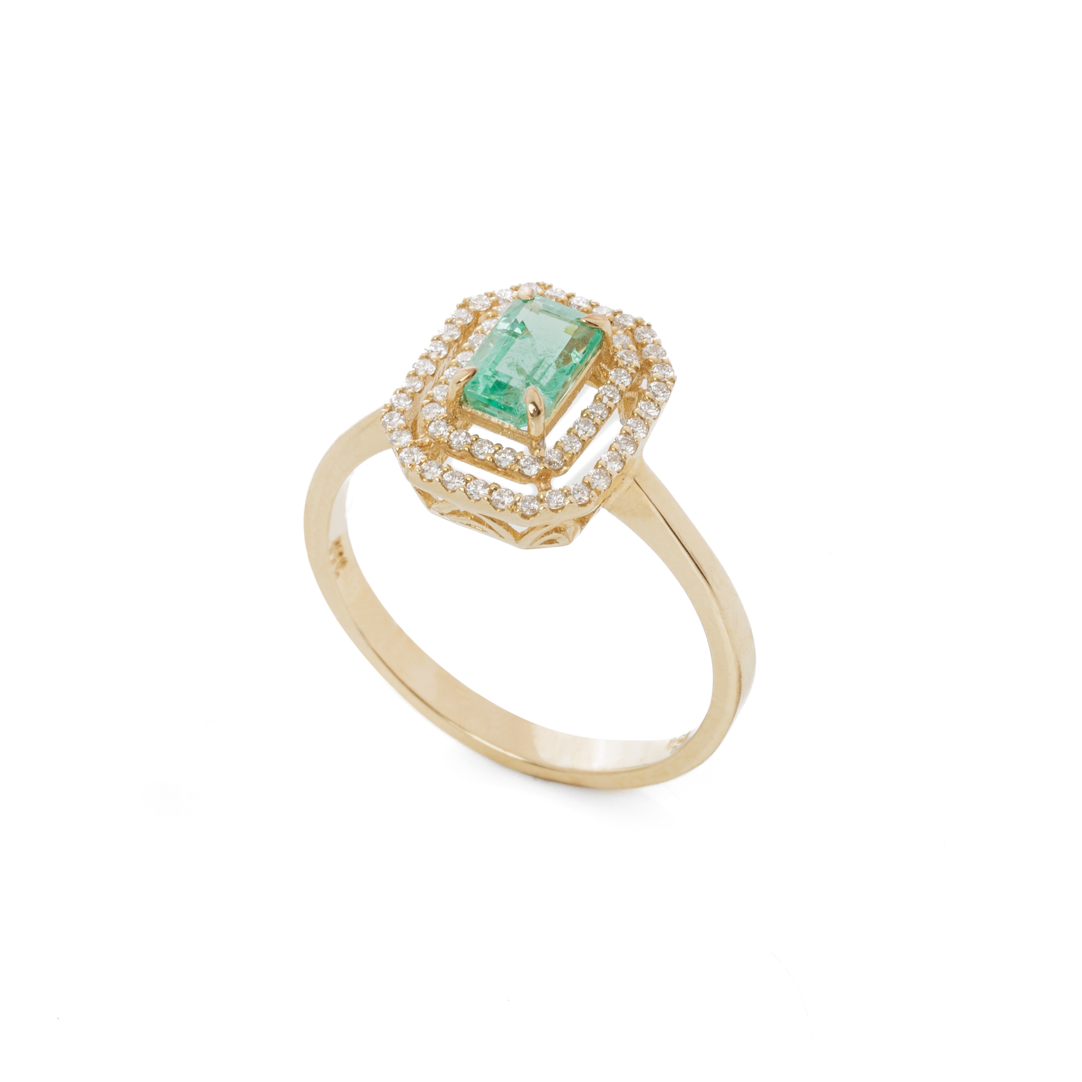Εντυπωσιακό δαχτυλίδι από κίτρινο χρυσό 18 καρατίων με δύο σειρές αστραφτερά διαμάντια και ορυκτό σμαράγδι emerald κοπής στο κέντρο του.