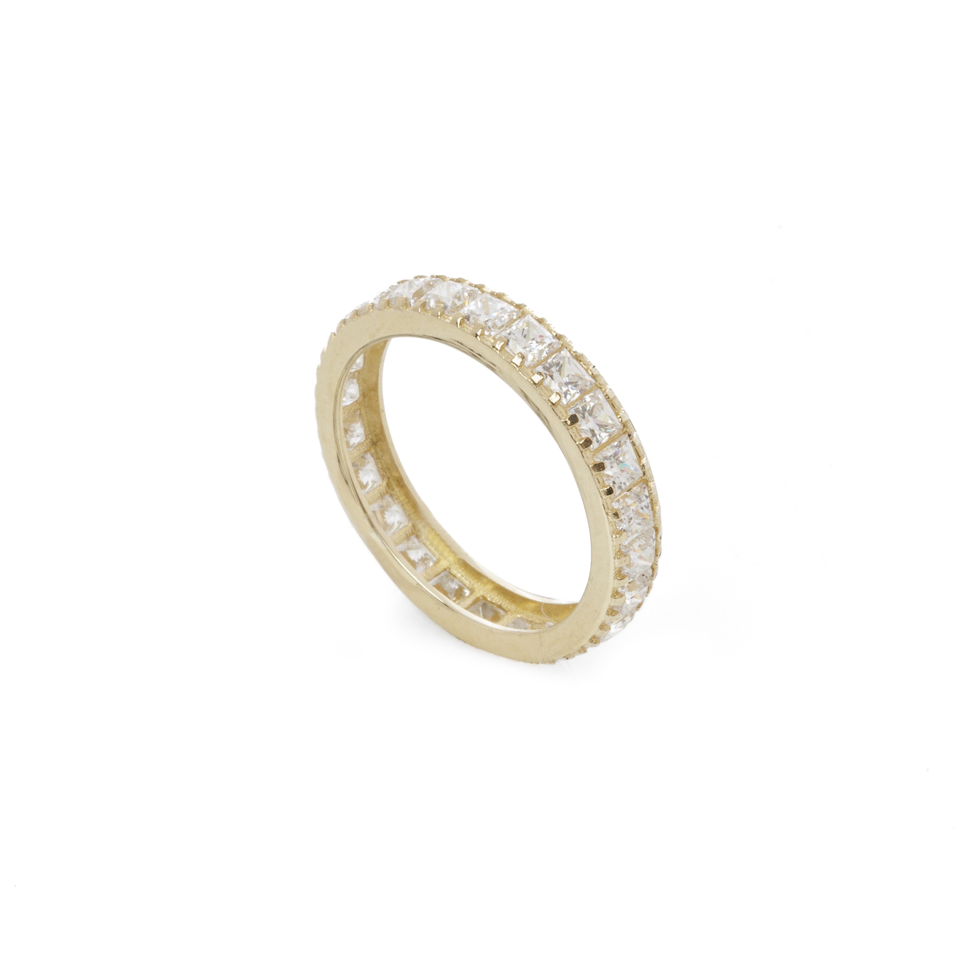 Δαχτυλίδι ολόβερο, γυαλιστερό σε λευκόχρυσο 14 καρατίων (κ585). Αποτελείται από μία σειρά με πέτρες ζιργκόν εξαιρετικής ποιότητας, που δίνουν στο κόσμημα αστραφτερή λάμψη.