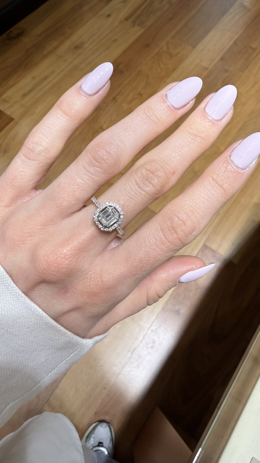 Εντυπωσιακό δαχτυλίδι από λευκόχρυσο 18 καρατίων (750). Το δαχτυλίδι είναι πολύπειρο με διαμάντια και σχηματίζει ροζέτα σε οκτάγωνο σχήμα.