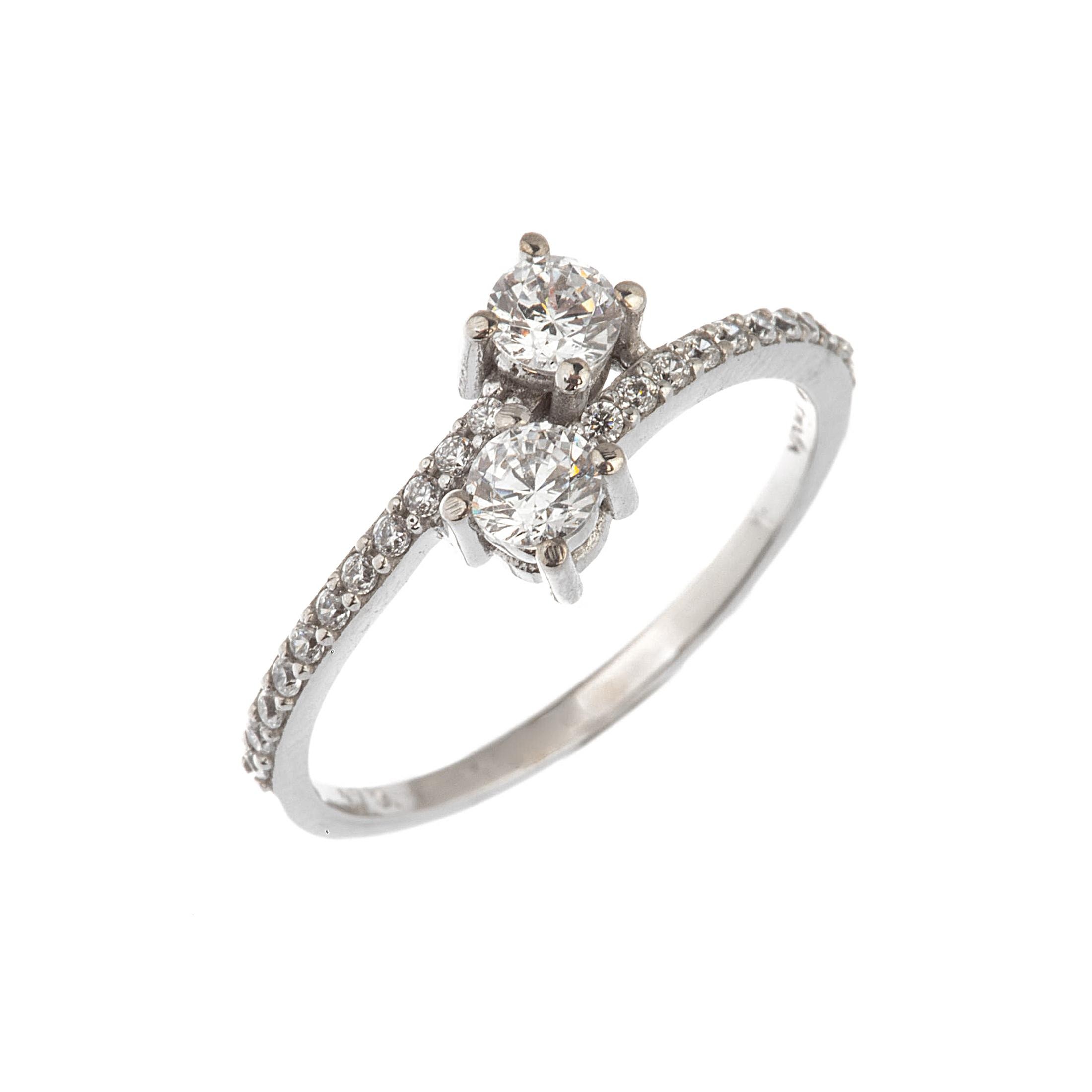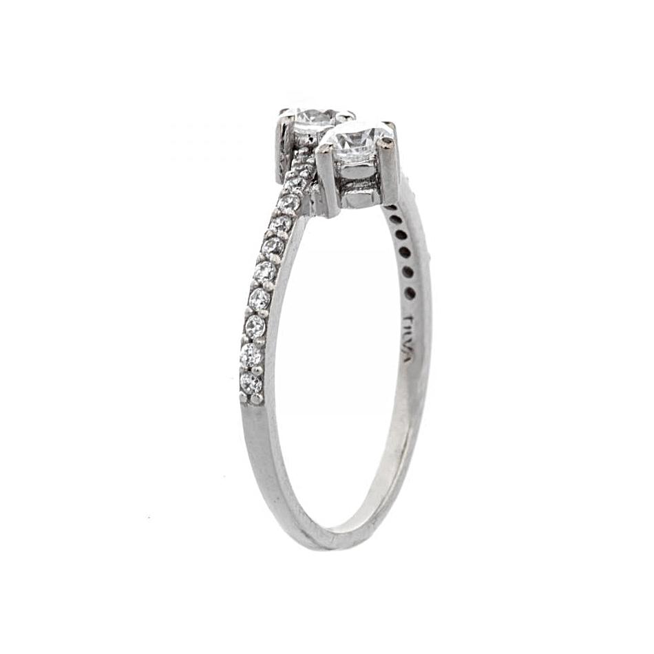 Μονόπετρο κλασσικό με γυαλιστερή βάση από λευκόχρυσο 9 καρατίων. Περιλαμβάνει δύο μεγάλες, λαμπερές κεντρικές zirgon πέτρες άριστης ποιότητας και με ιδιαίτερη λάμψη, οι οποίες στηρίζονται από τέσσερα δοντάκια η καθεμία και στο πλάι επάνω στη βάση του δαχτυλιδιού υπάρχουν μικρότερες ζιργκόν πέτρες.