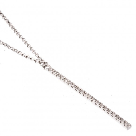 Εντυπωσιακό, κλασσικό κρεμαστό από λευκόχρυσο 18 καρατίων του ιταλικού οίκου κοσμημάτων Bizzotto Gioielli. Το κολιέ αποτελείται από κλασσική λευκόχρυση αλυσίδα από το κέντρο της οποίας κρέμεται μία σειρά από διαμάνται συνολικού βάρους 0.14ct.