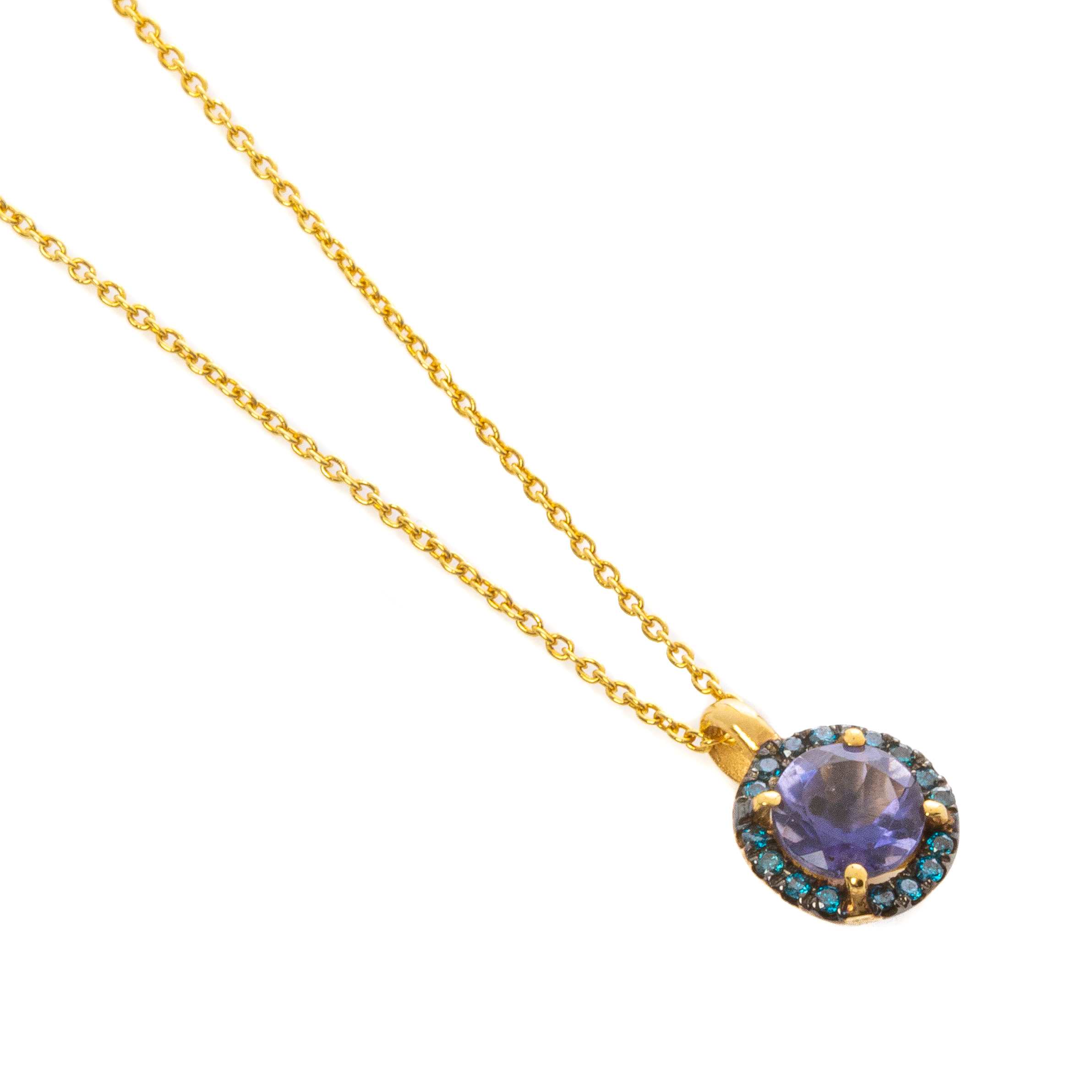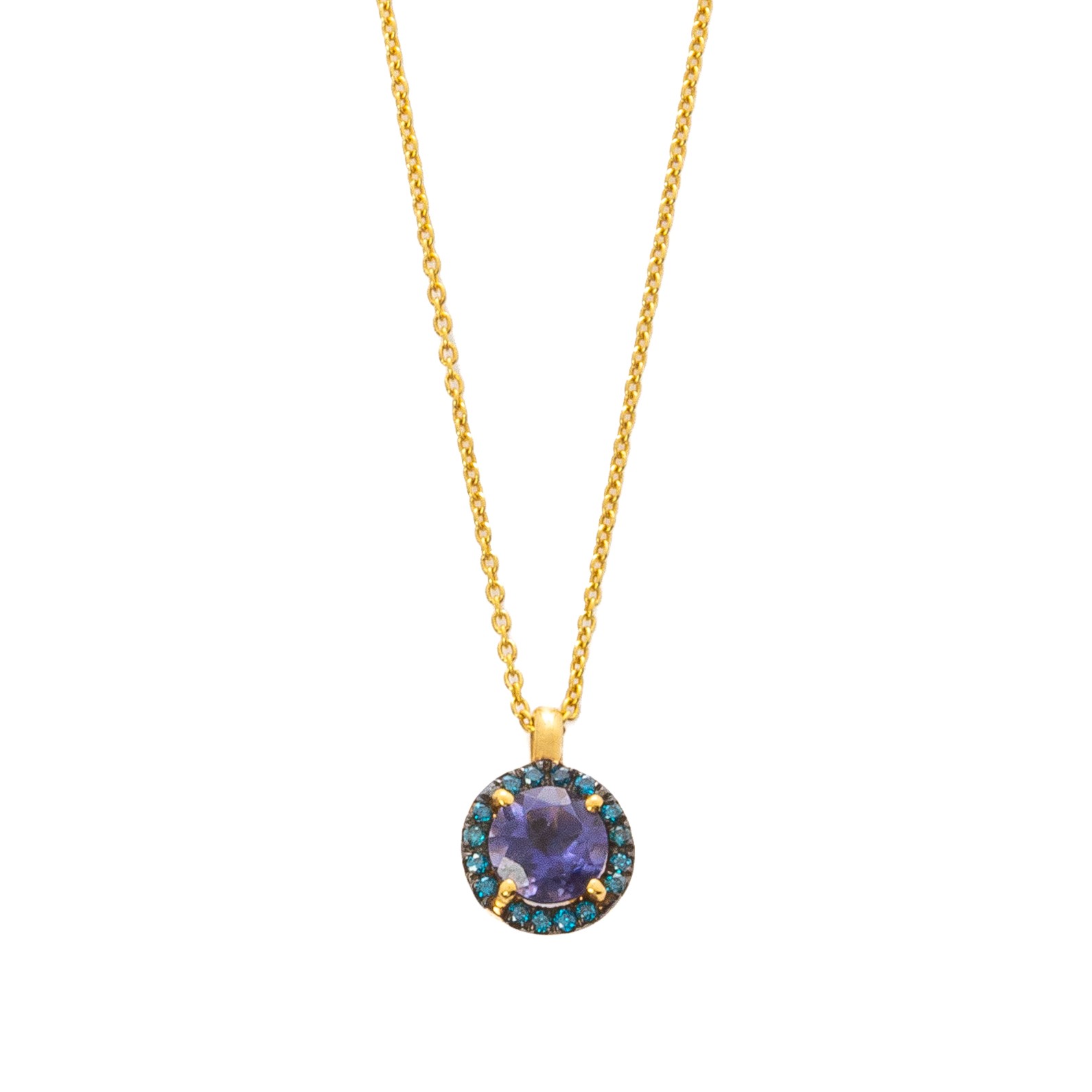 Διαχρονικό κολιέ από λευκόχρυσο 18 καρατίων (750) με διαμάντια και στο κέντρο ιολίτης κοπής round σε πολύ καλή ποιότητα και χρώμα.