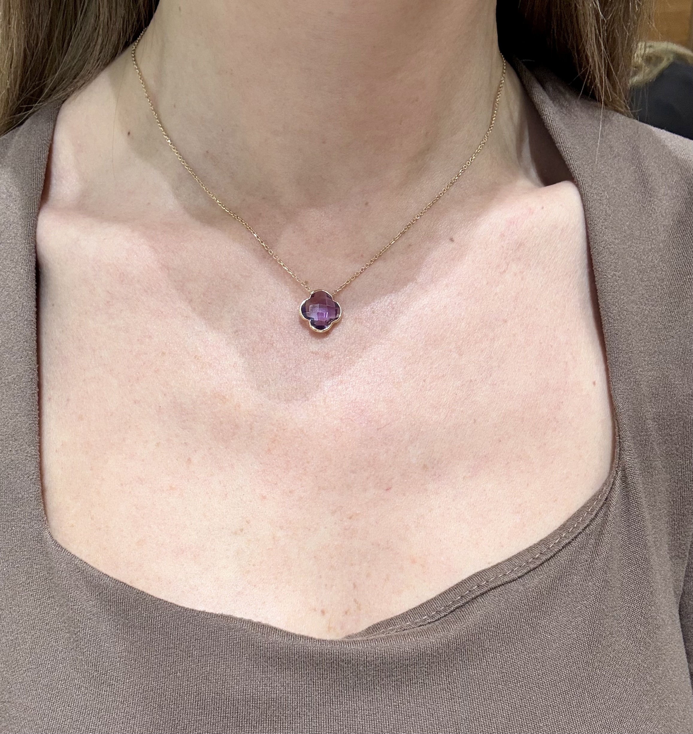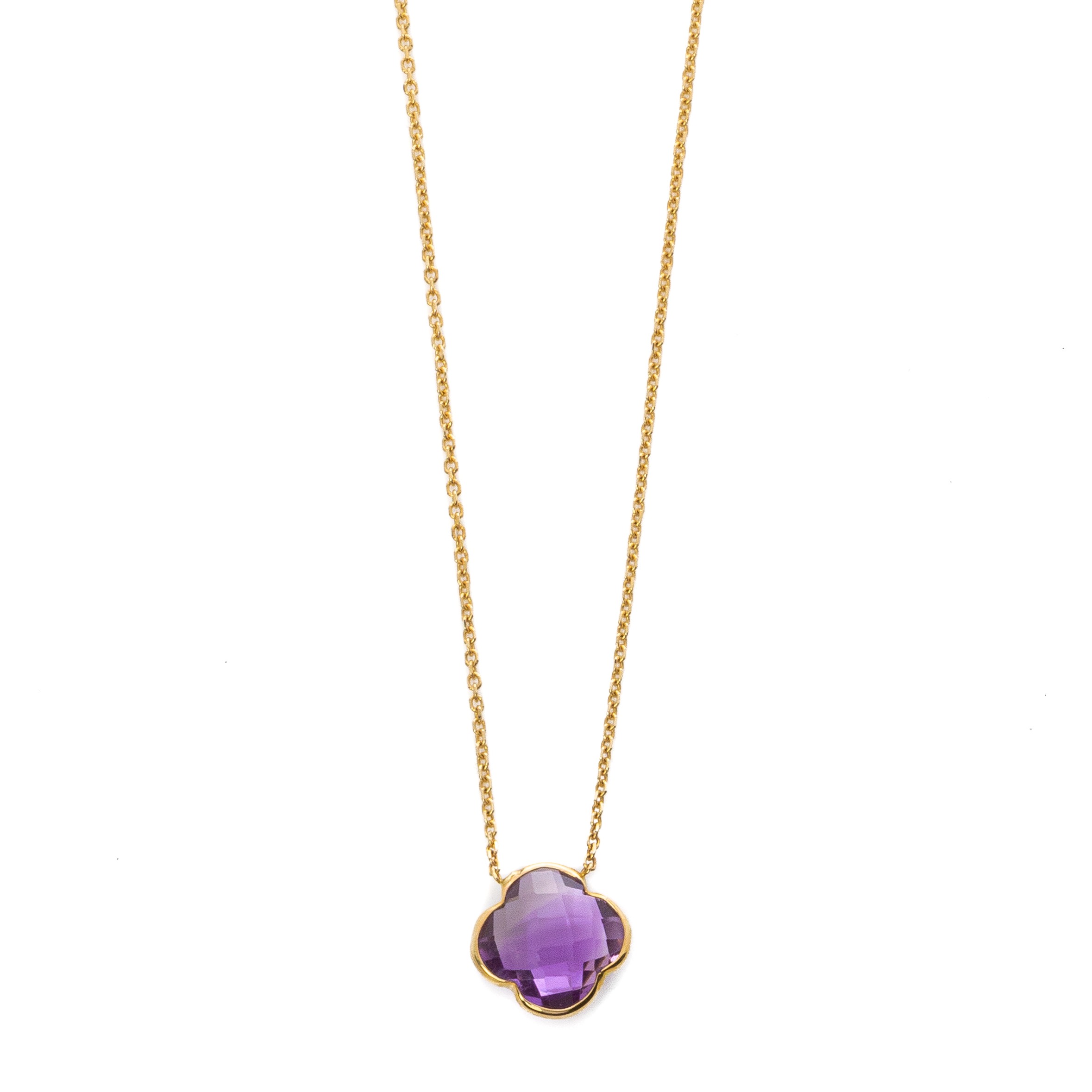 Εντυπωσιακό κολιέ από κίτρινο χρυσό 14 καρατίων (585) με αμέθυστο σε ιδιαίτερο σχήμα στο κέντρο του.