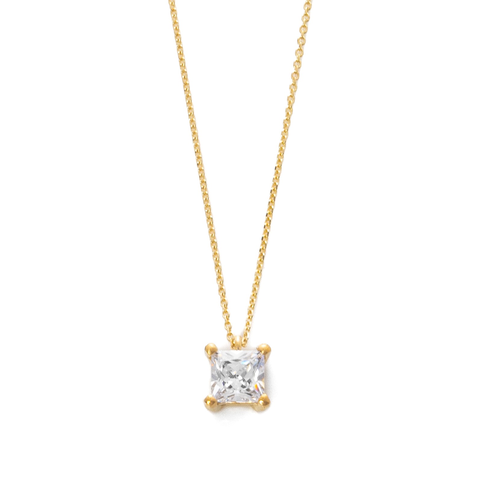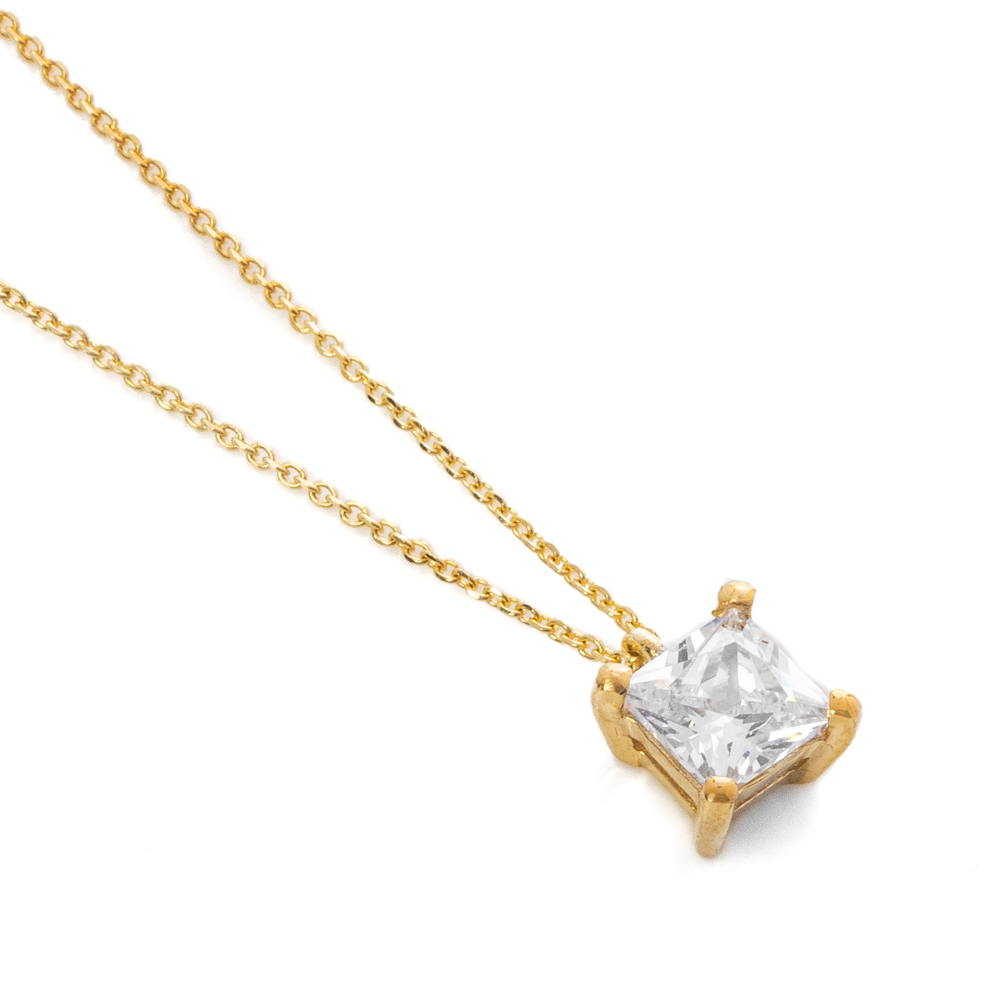 Κλασσικό και μίνιμαλ κρεμαστό, ενσωματωμένο επάνω στην αλυσίδα, από κίτρινο χρυσό 9 καρατίων (375). Το κρεμαστό περιέχει μία αστραφτερή συνθετική πέτρα ζιργκόν άριστης ποιότητας καρφωμένη επάνω σε τέσσερα δοντάκια σε τετράγωνο σχήμα. Η τιμή αναφέρεται σε ολόκληρο το κολιέ (κρεμαστό και αλυσίδα). Το συνολικό μήκος της αλυσίδας είναι 40cm.