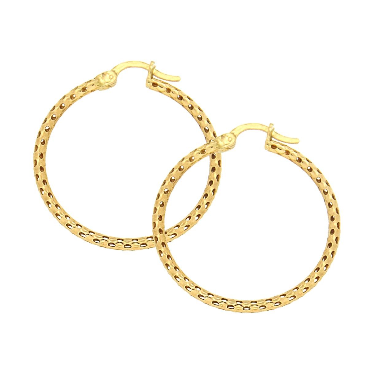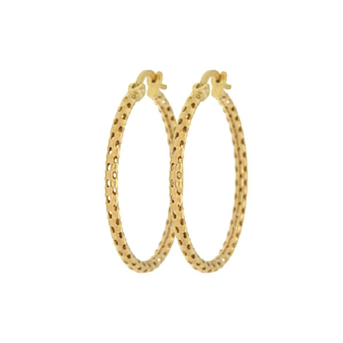 Πολυτελείς, γυαλιστεροί,στρογγυλεμένοι κρίκοι από χρυσό 14 καρατίων (585). Αποτελούνται από μικρές στρόγγυλες τρυπούλες σε όλη τους την επιφάνεια, που τους καθιστούν ιδιαίτερα ξεχωριστούς. Το κούμπωμά τους είναι περαστό από το αυτί. Οι κρίκοι αποτελούν ένα διαχρονικό κόσμημα, για όλες τις ώρες και πολύ εύκολο στο συνδυασμό τους με άλλα κοσμήματα.
