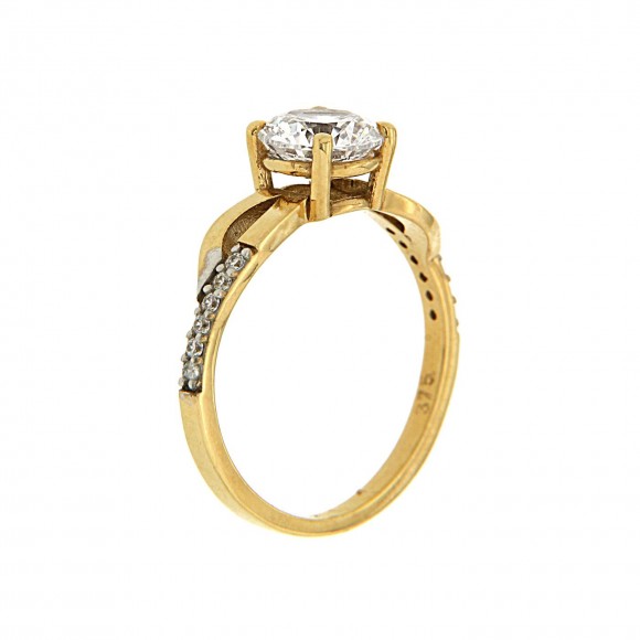 Μονόπετρο δίχρωμο με γυαλιστερή βάση από κίτρινο και λευκόχρυσο 14 καρατίων (κ585). Περιλαμβάνει μία κεντρική συνθετική πέτρα ζιργκόν άριστης ποιότητας και με ιδιαίτερη λάμψη, η οποία στηρίζεται από τέσσερα δοντάκια και στο πλάι επάνω στη βάση του δαχτυλιδιού υπάρχουν δώδεκα μικρότερες ζιργκόν πέτρες.