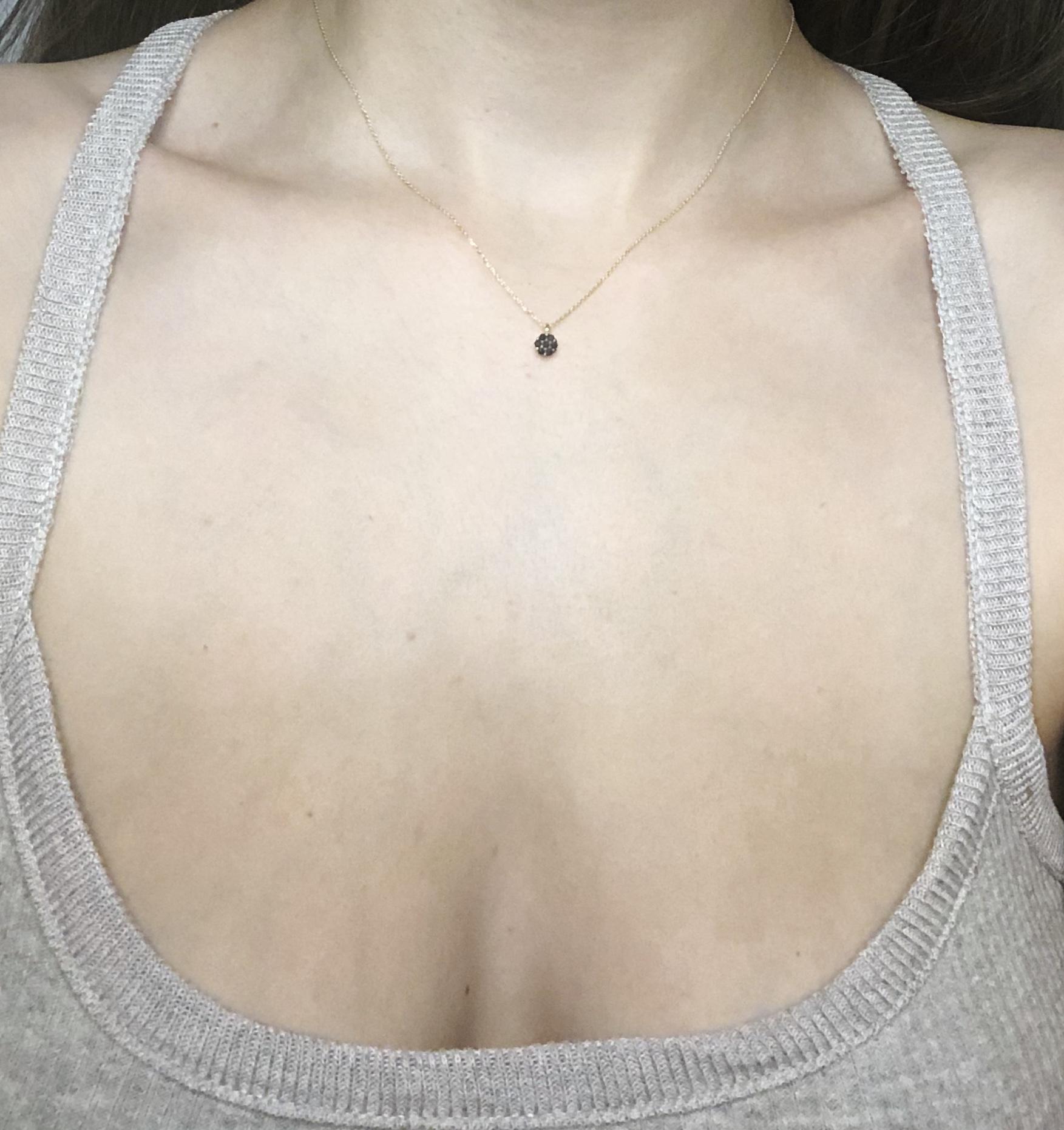 Μίνιμαλ κολιέ ροζέτα από κίτρινο χρυσό 9 καρατίων με αστραφτερές, συνθετικές ζιργκόν πέτρες μαύρες όλες ίδιου μεγέθους. Η ροζέτα είναι στρόγγυλη. Η τιμή αναφέρεται στο κρεμαστό και την αλυσίδα, που έχει μήκος 40 εκατοστά.