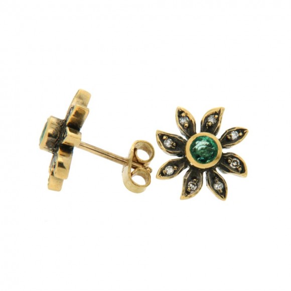Ένα πολύ όμορφο σκουλαρίκι αντικέ, 18 καρατίων σε σχήμα λουλουδιού, με 16 διαμάντια και 2 σμαράγδια.