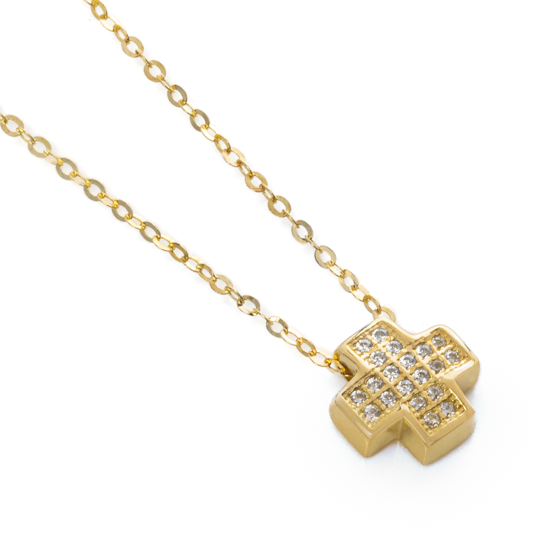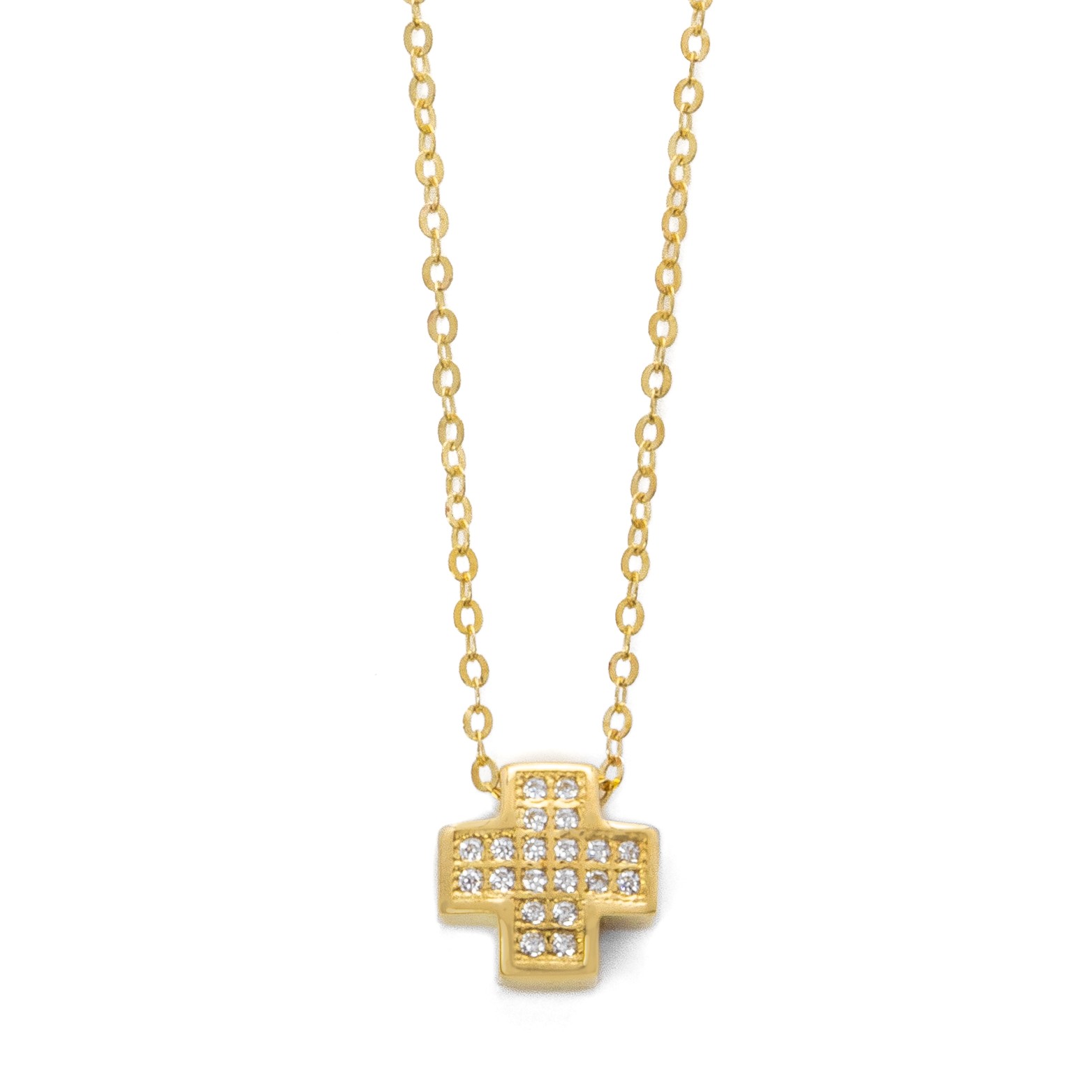 Μοντέρνος και minimal σταυρός, ενσωματωμένος επάνω στην αλυσίδα, από κίτρινο χρυσό 9 καρατίων (375). Ο σταυρός είναι τετραγωνισμένος και περιέχει συνθετικές πέτρες ζιργκόν άριστης ποιότητας. Η τιμή αναφέρεται σε ολόκληρο το κολιέ (σταυρός και αλυσίδα).