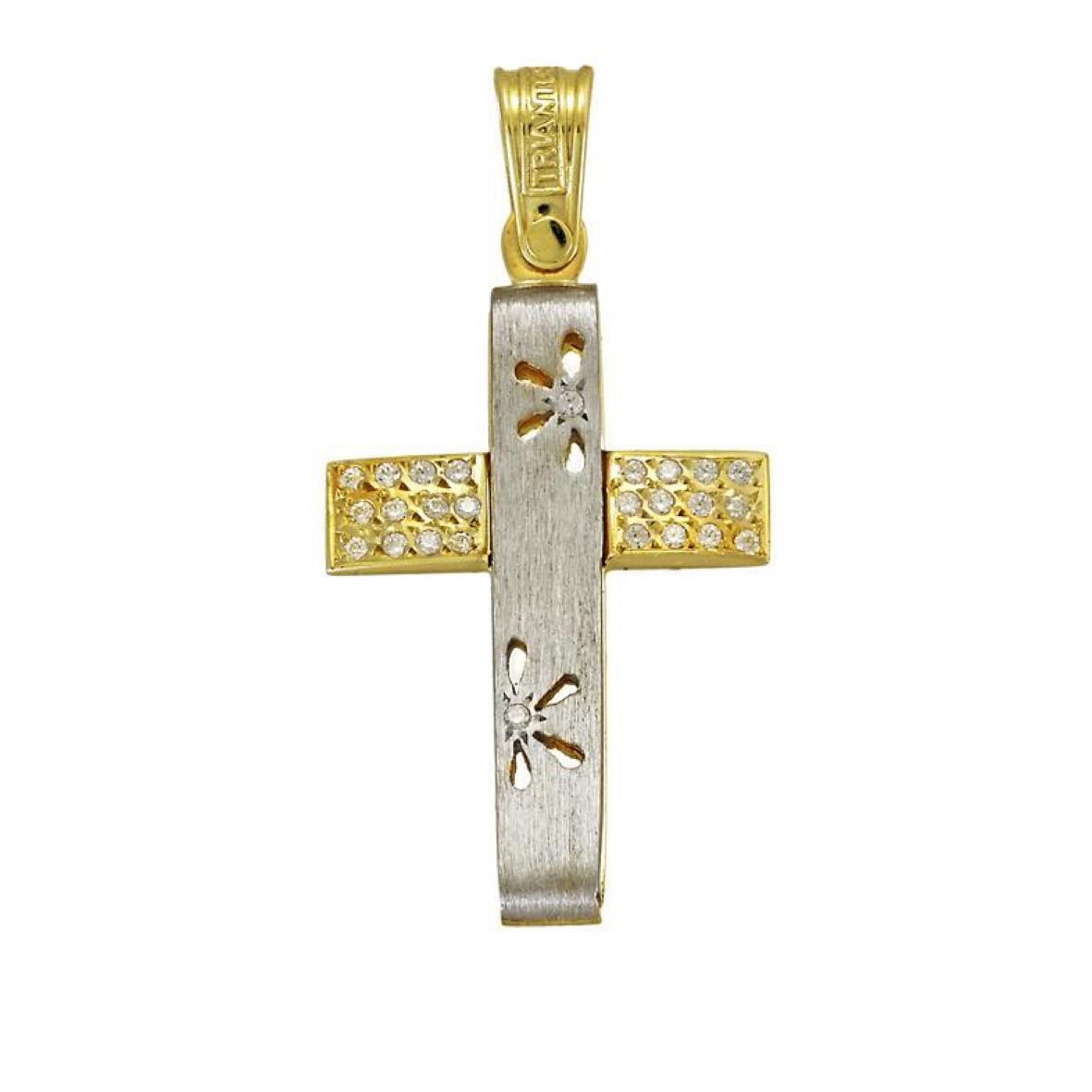Πολυτελής, κλασσικός σταυρός δίχρωμος γυαλιστερός και ματ. Στο κέντρο του είναι λευκόχρυσος ματ με δύο μεγάλα λουλούδια και στα δύο πλαϊνά τμήματα είναι χρυσός, γεμάτος με συνθετικές πέτρες (zirgon).
