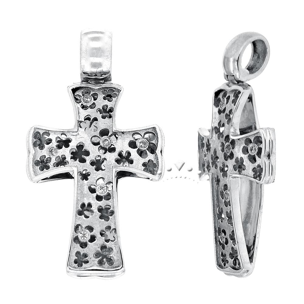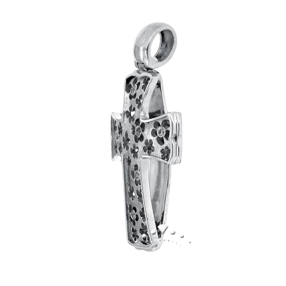 Σταυρός μοντέρνος, λευκόχρυσος 14 καρατίων (κ585). Στον σταυρό υπάρχουν διάσπαρτα ζιργκόν, όλα εξαιρετικής ποιότητας που δίνουν στο κόσμημα αστραφτερή λάμψη.