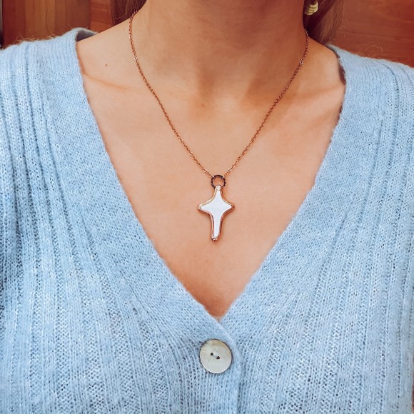 Σταυρός μοντέρνος με άσπρο σμάλτο, γυαλιστερός από ροζ χρυσό, 14 καρατίων (κ.585), με ενσωματωμένη αλυσίδα.