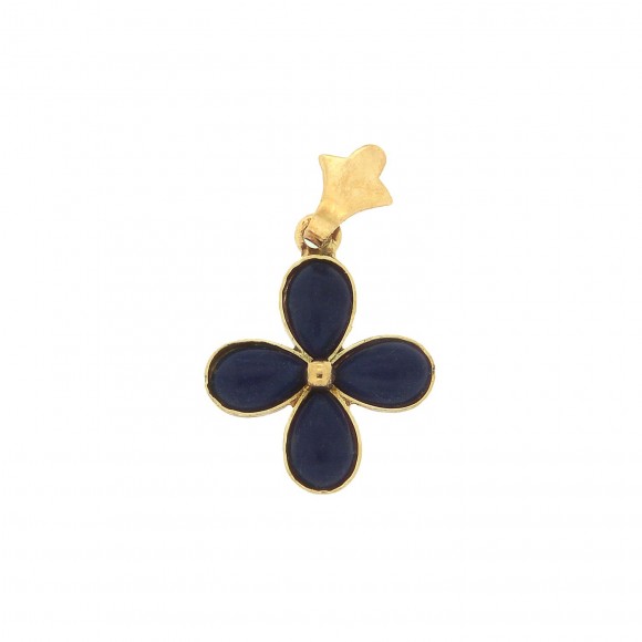 Διαχρονικός σταυρός από κίτρινο χρυσό 14 καρατίων (585) με τέσσερα ημιπολύτιμα λάπις λάζουλι άριστης ποιότητας σε μπλε χρώμα. Το σχέδιό του είναι καμπυλωτό και μπορείτε να βρείτε το ίδιο σε μεγαλύτερο μέγεθος εδώ.