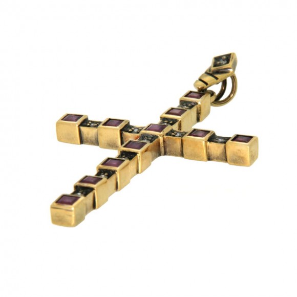 Ένας πολύ ιδιαίτερος χειροποίητος σταυρός, αντικέ 18 καρατίων με μπριγιάν και ορυκτά ρουμπίνια. Στη τιμή δεν συμπεριλαμβάνεται η αλυσίδα.