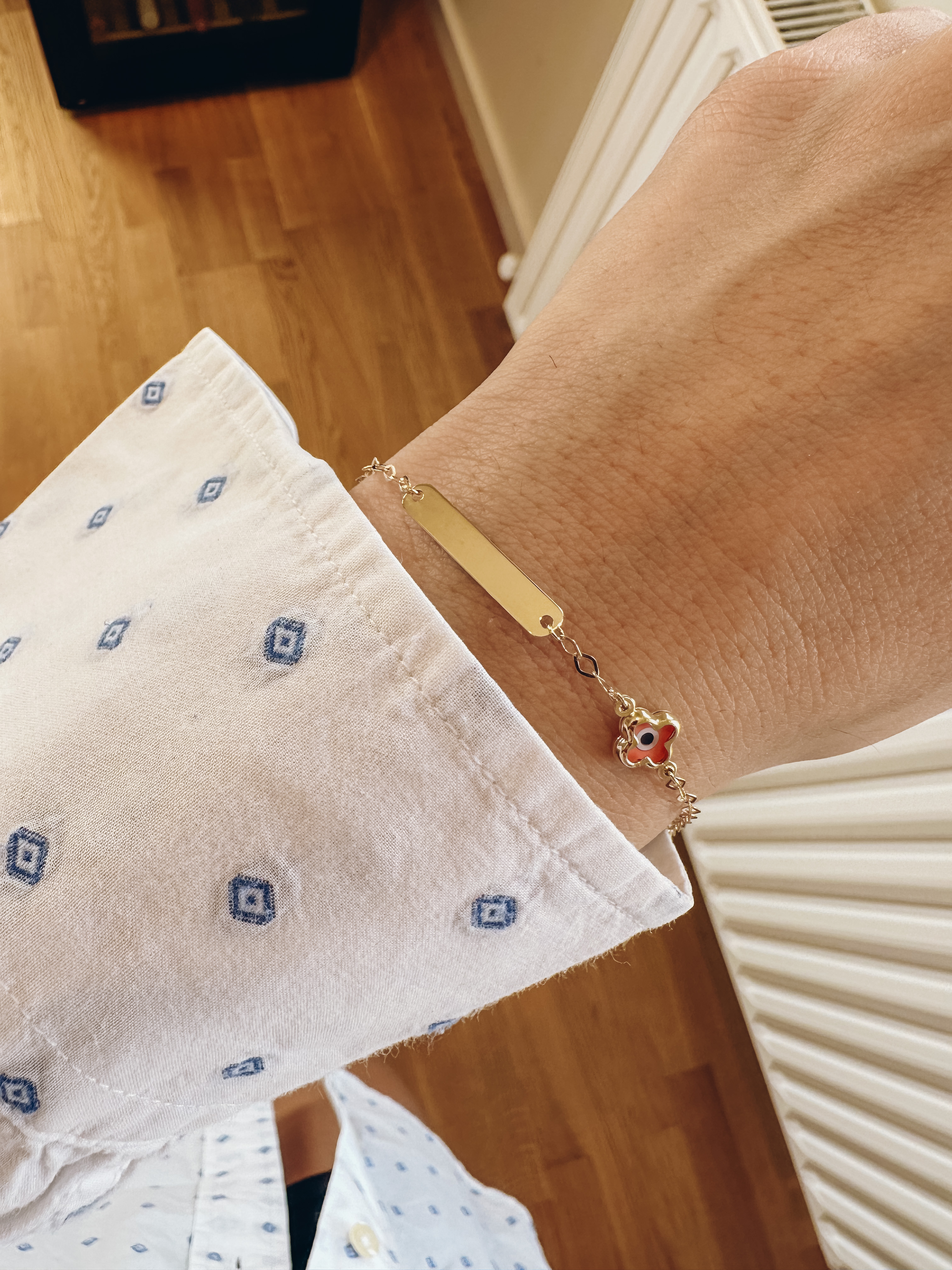 Minimal, γυαλιστερή παιδική ταυτότητα από χρυσό 9 καρατίων με αλυσίδα που μπορεί να κουμπώσει σε όλους τους κρίκους της και να προσαρμοστεί εύκολα σε παιδικό χέρι. Η πλάκα της ταυτότητας είναι σκέτη γυαλιστερή. Δίπλα στην πλάκα υπάρχει ένα μάτι ροζ.