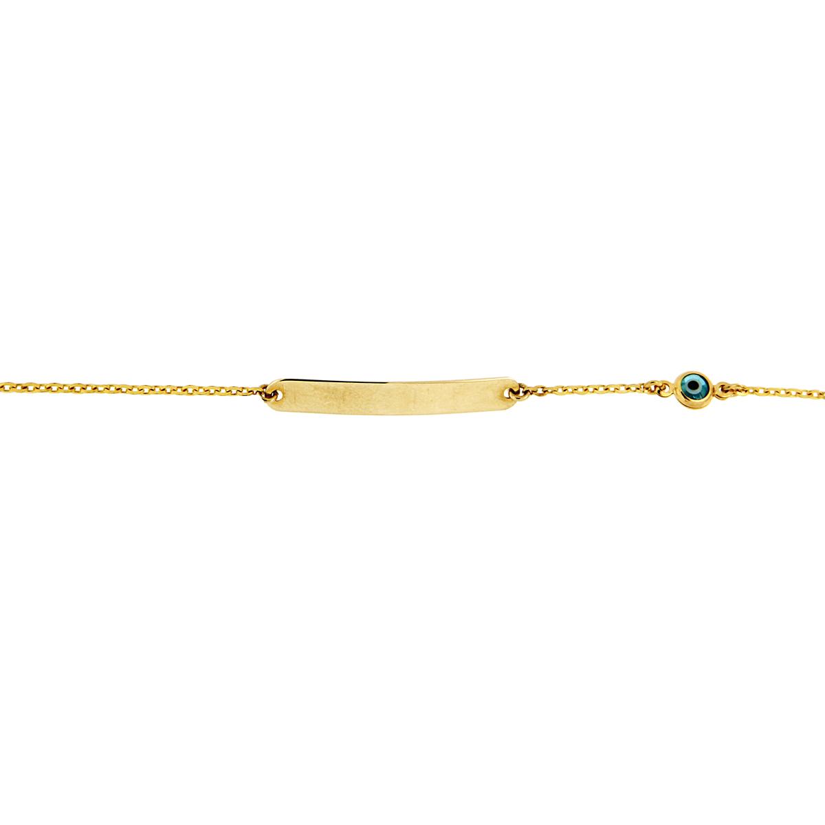 Minimal, γυαλιστερή παιδική ταυτότητα από χρυσό 9 καρατίων. Η πλάκα της ταυτότητας είναι σκέτη γυαλιστερή και δίπλα της περαστή επάνω στην αλυσίδα βρίσκεται ένα charm μάτι στρόγγυλο σε μπλε χρώμα.
