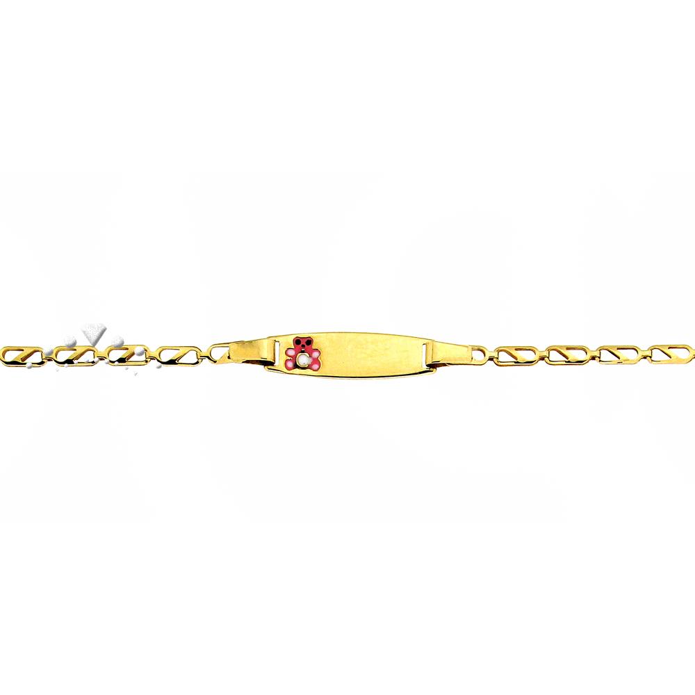 Minimal, γυαλιστερή παιδική ταυτότητα από χρυσό 9 καρατίων με χοντρή αλυσίδα, που μπορεί να κουμπώσει σε όλους τους κρίκους της και να προσαρμοστεί εύκολα σε παιδικό χέρι. Η πλάκα της ταυτότητας είναι σκέτη γυαλιστερή και επάνω της απεικονίζεται ένας αρκούδος σε φουξ χρώμα.