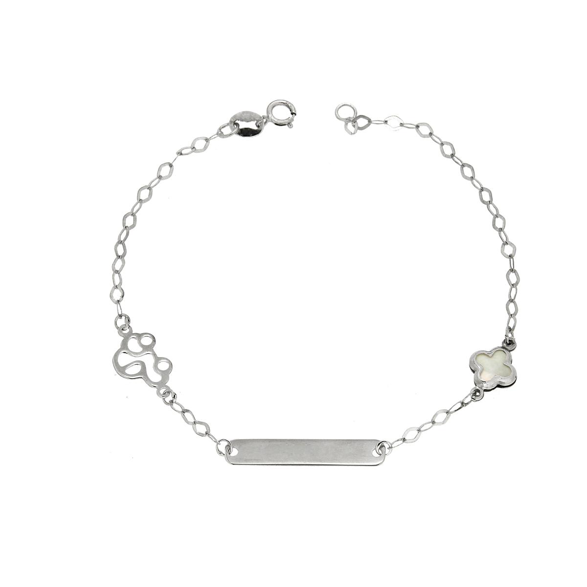 Minimal, γυαλιστερή παιδική ταυτότητα από λευκόχρυσο 9 καρατίων. Η πλάκα της ταυτότητας είναι σκέτη γυαλιστερή και αμφίπλευρά της υπάρχουν ένα αυτοκίνητο και ένας σταυρός λευκός.
