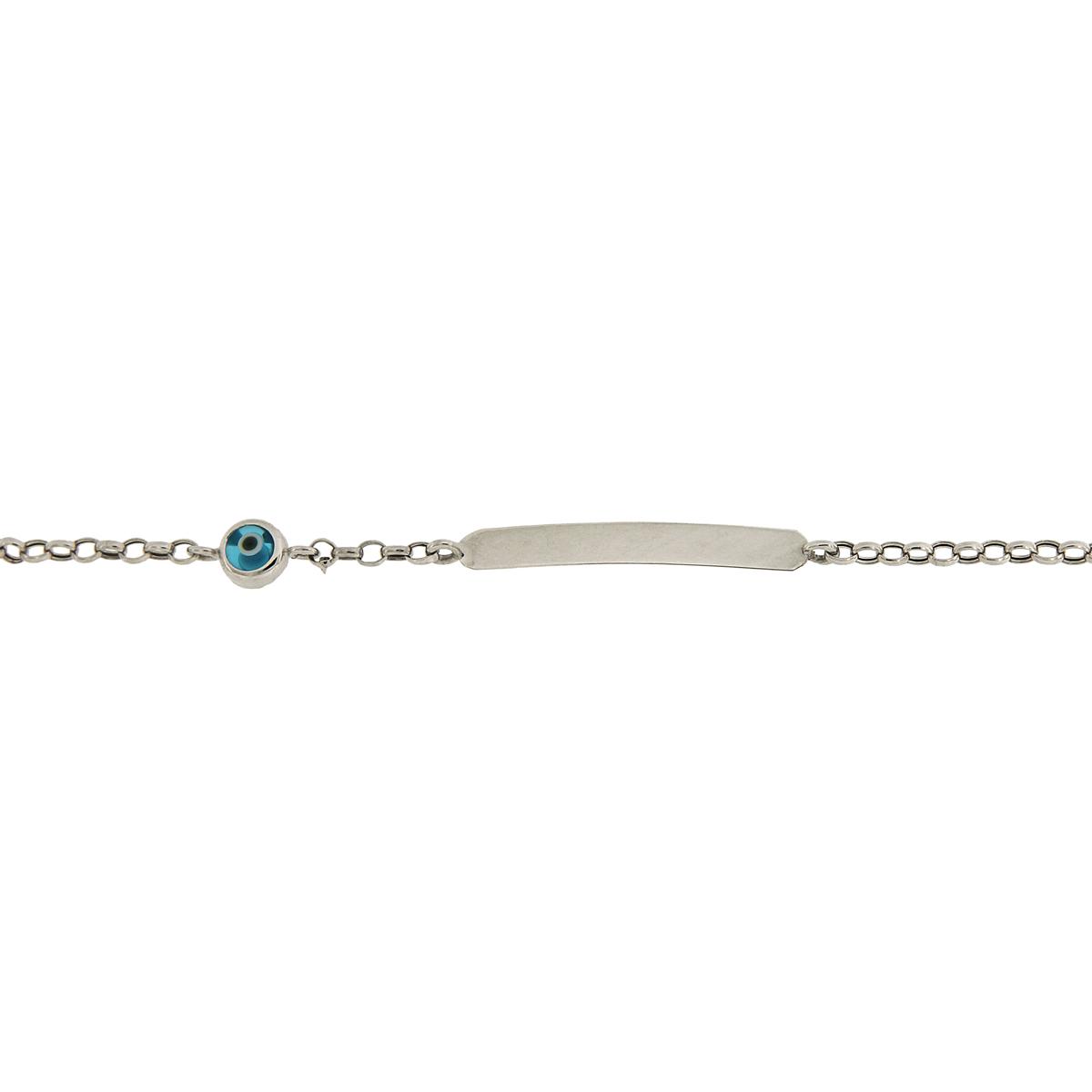 Minimal, γυαλιστερή παιδική ταυτότητα από λευκόχρυσο 14 καρατίων. Η πλάκα της ταυτότητας είναι σκέτη γυαλιστερή και δίπλα της περαστή επάνω στην αλυσίδα βρίσκεται ένα charm μάτι στρόγγυλο σε μπλε χρώμα.