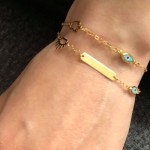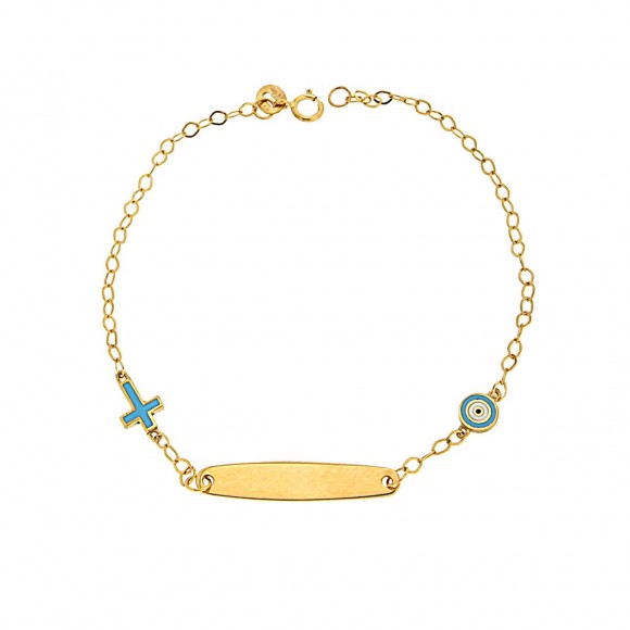 διαίτερα εντυπωσιακό και minimal βραχιόλι ταυτότητα από χρυσό 9 καρατίων με σκέτη γυαλιστερή πλάκα και κρίκους στην αλυσίδα της. Αμφίπλευρα της πλάκας της βρίσκονται ένας σταυρός μς τυρκουάζ σμάλτο και χρυσό περίγραμμα και ένα μάτι χρυσό με λευκό και τυρκουάζ σμάλτο. Αποτελεί μία υπέροχη επιλογή βραχιολιού για να κοσμήσει το χέρι μίας κυρίας !