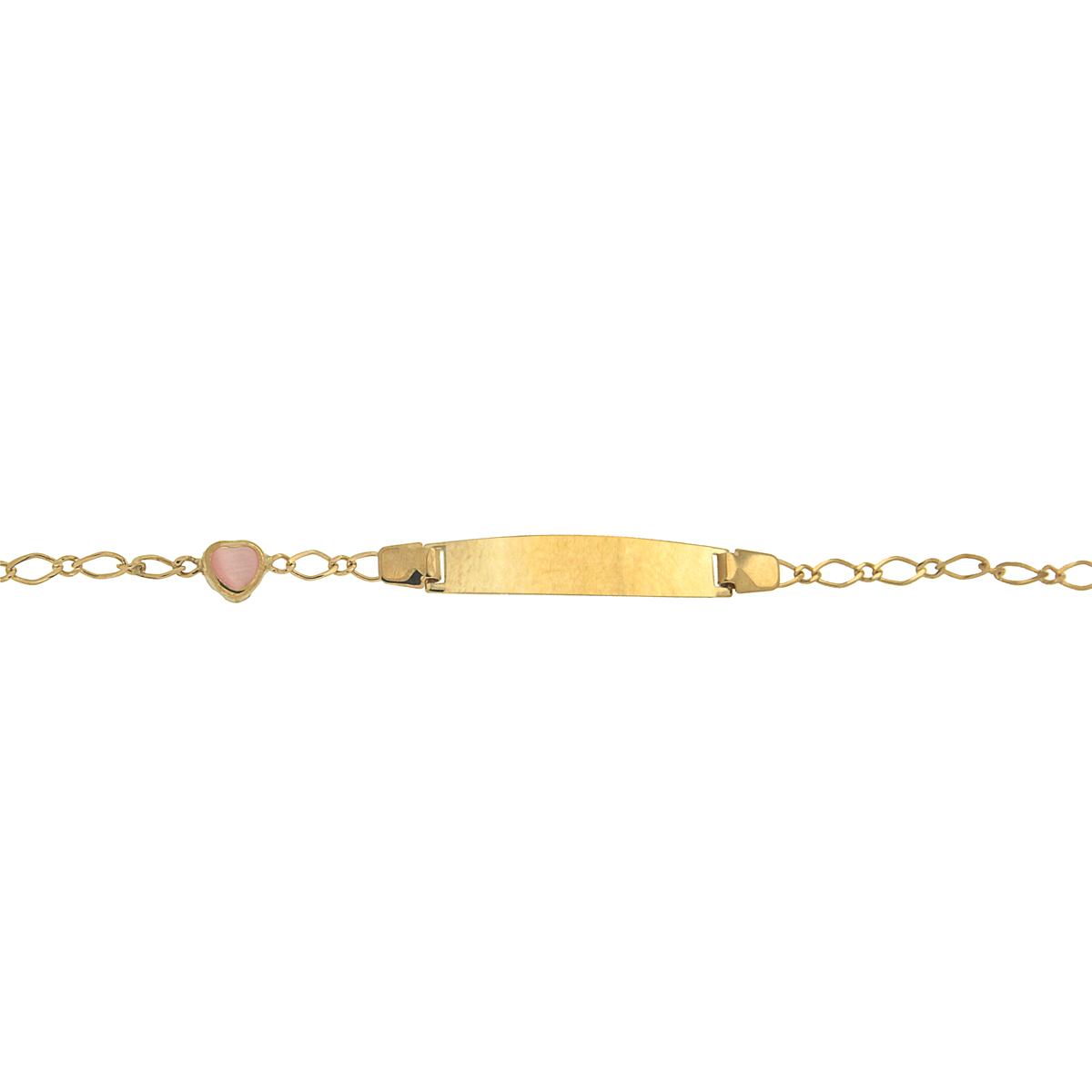 Minimal, γυαλιστερή παιδική ταυτότητα από χρυσό 9 καρατίων. Η πλάκα της ταυτότητας είναι σκέτη γυαλιστερή και δίπλα της περαστό επάνω στην αλυσίδα βρίσκεται ένα charm καρδιά σε ροζ χρώμα. Το βραχιόλι αποτελείται από χοντρούς κρίκους και μπορεί να κουμπώσει σε οποιονδήποτε από αυτούς και έτσι να προσαρμοστεί με ευκολία σε παιδικό χέρι.