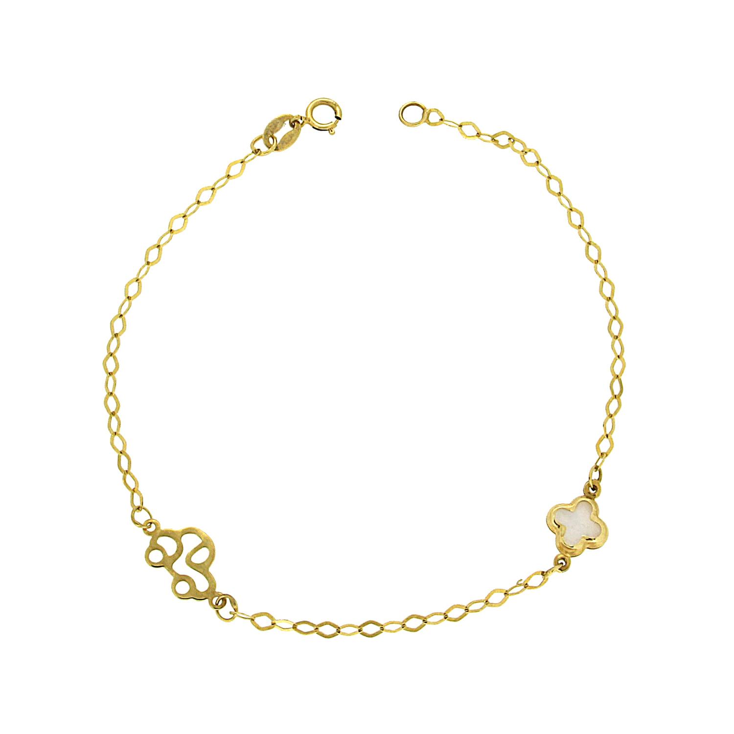 Μοντέρνο, minimal, γυαλιστερό (χωρίς κανένα ματ στοιχείο) βραχιόλι από χρυσό 9 καρατίων με charm σταυρό, όπου στο εσωτερικό του αποτελείται από λευκό ημιπολύτιμο λίθο. Περιλαμβάνει σε απόσταση λίγων εκατοστών και charm αυτοκίνητο σκέτο, γυαλιστέρο. Μπορεί να συνδυαστεί εύκολα και να φορεθεί μαζί με άλλα βραχιόλια.