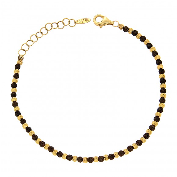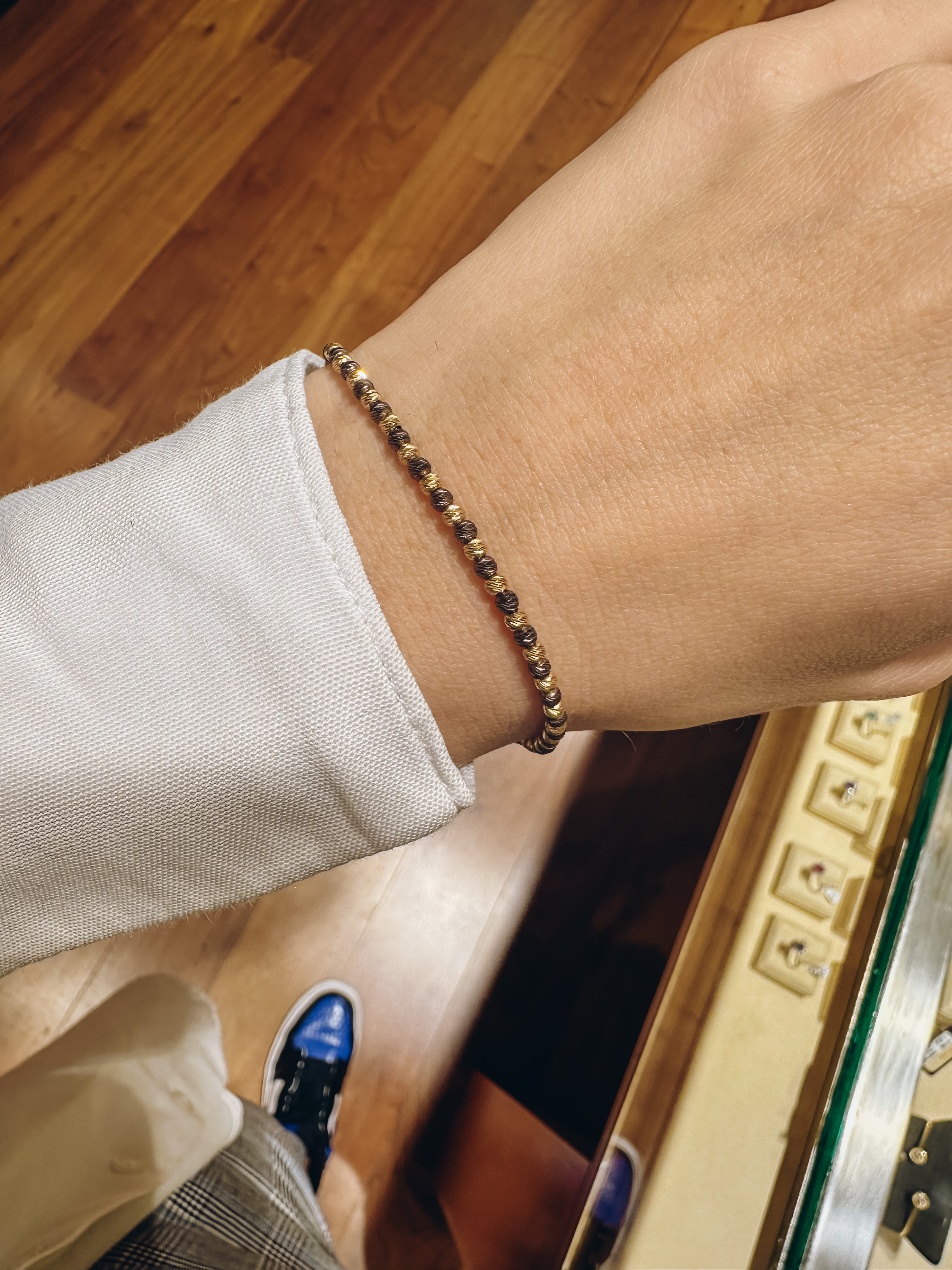 Το βραχιόλι είναι δίχρωμο και έχει εναλλάξ μία μπίλια σε κίτρινο χρυσό και μία σε πολύ σκούρο ροζ χρυσό, το οποίο έχει πάρει αυτό το χρώμα με ειδική επεξεργασία. Είναι ολόχρυσο όλο το βραχιόλι.